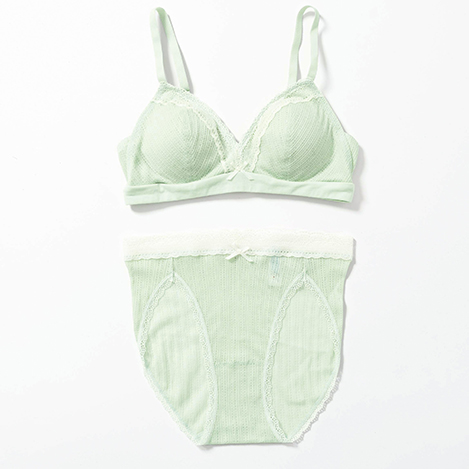 ノンワイヤーブラはアンダーにゴムではなくストレッチ素材のパワーネットを入れ伸びを出しているので、締め付けず快適な着心地。スタンダードショーツはレースとリボンを効かせフェミニンに。