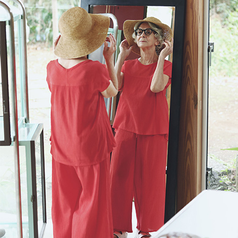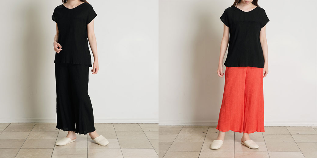 軽やかな着心地が魅力のトップスは、ほどよくゆとりのあるシルエットで、前後差のある丈とスリット入りのデザインがこなれた印象に。インせず着てもバランスよく決まります。ワイドパンツは足さばきもスムーズで快適。明るい印象を与えるレッドと、万能なブラックの2色展開。ルームウエアとしてはもちろん、ワンマイルや旅先にもぴったりな一着です。