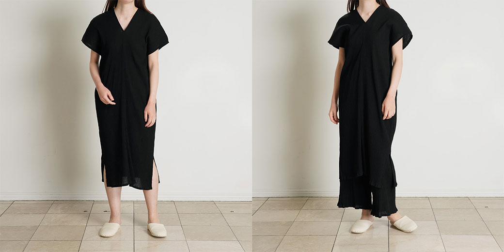 V開きがすっきり見えのワンピース。身頃から続く袖などできるだけ縫い目を少なくしストレスのない仕様にこだわりました。一枚でさらりと着こなすのはもちろん、同素材のボトムと合わせれば、より洗練されたセットアップスタイルが完成します。