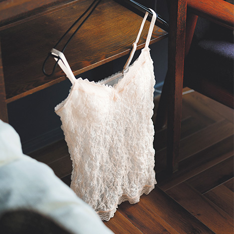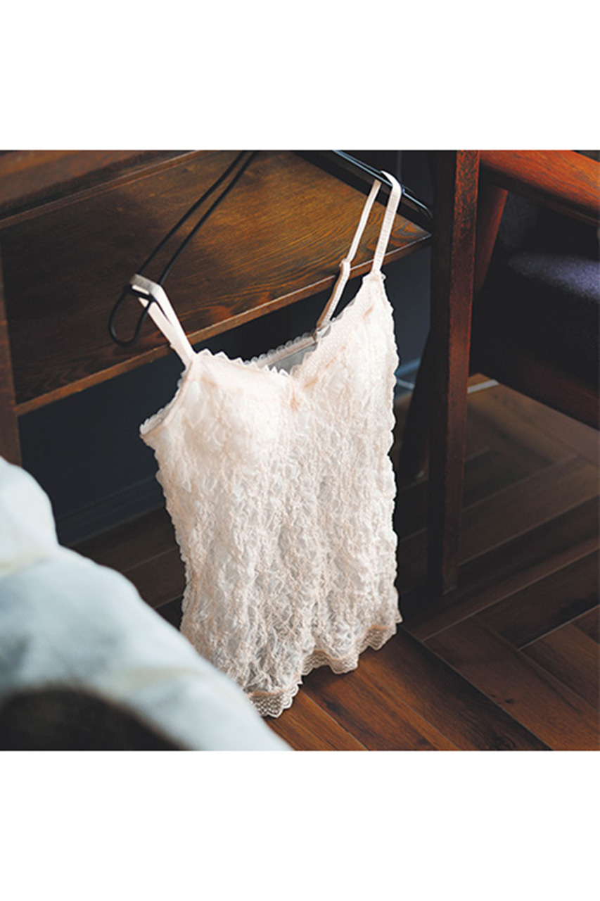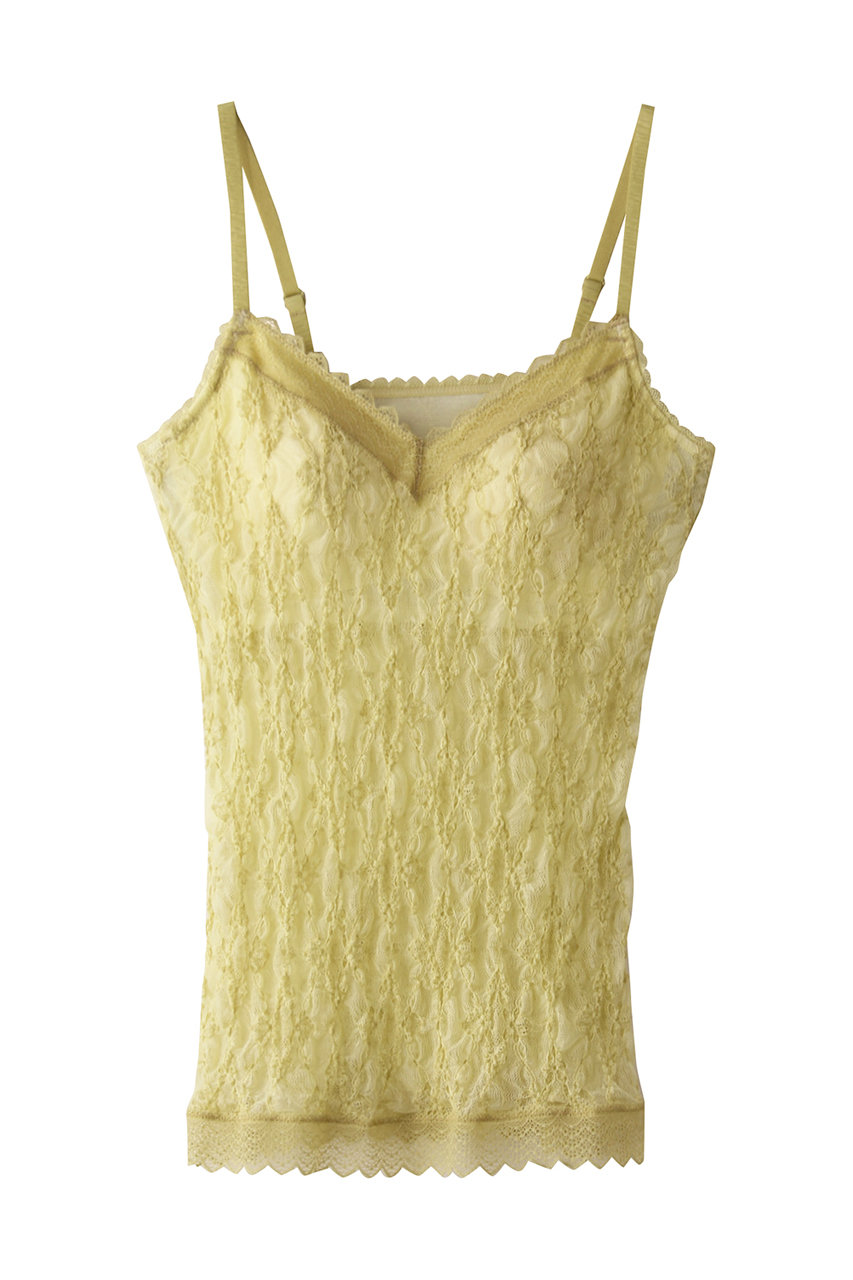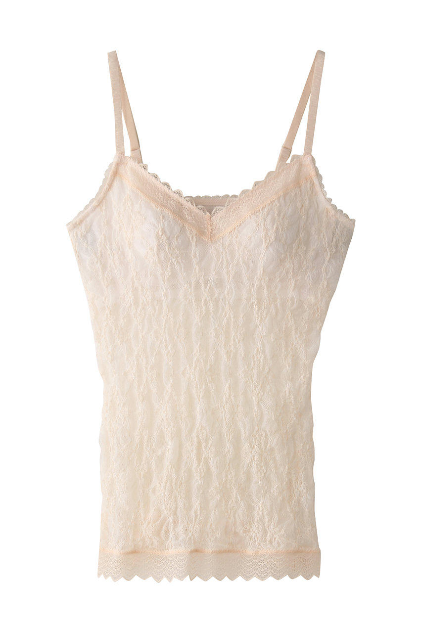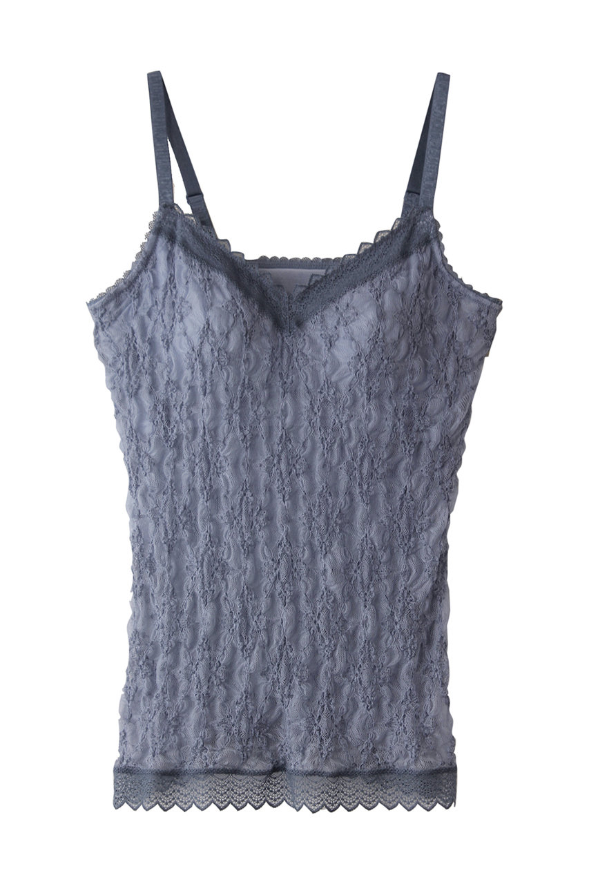 軽いV開きの取り外し可能なカップ付きキャミソールは、ブラジャー無しでも1枚で着られる便利なアイテム。カップ裏地はカップ側、背中側ともにあり綿混パワーネットでレースを活かしつつ肌に優しい仕様に。程よいホールド感でサラッとした着心地とレースの美しさが楽しめます。