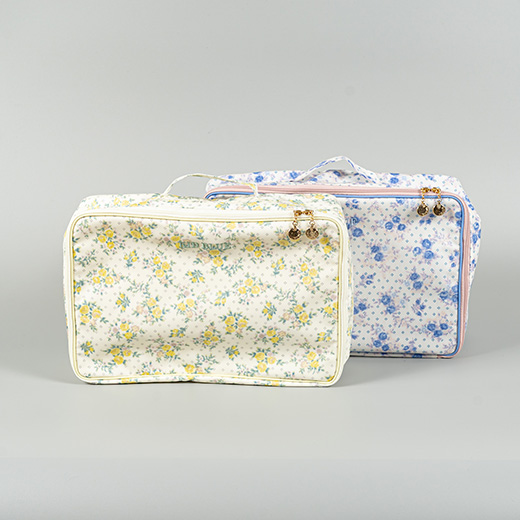 2~3泊の旅行に適した大きさのランジェリーケース。持ち運びしやすいハンドバッグ型でキッドブルーのロゴ刺しゅうがポイント。表面はラミネート加工を施しているので扱いやすい。中身を分けて使える便利な巾着付きです。