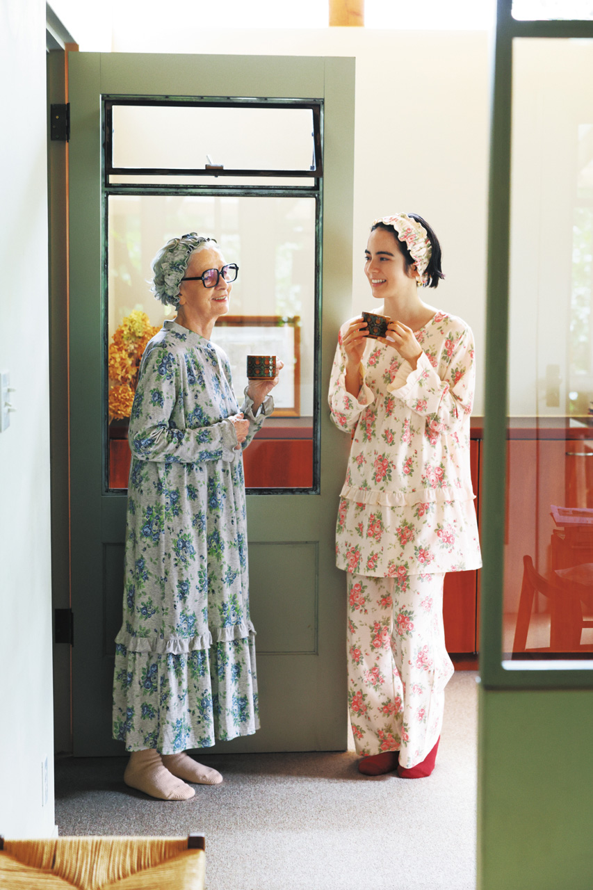 パジャマのトップスはメローやギャザーなどのディティールとコクーンシルエットでトレンド感を演出し、ナイティはゆったりとしたかぶりタイプながら、