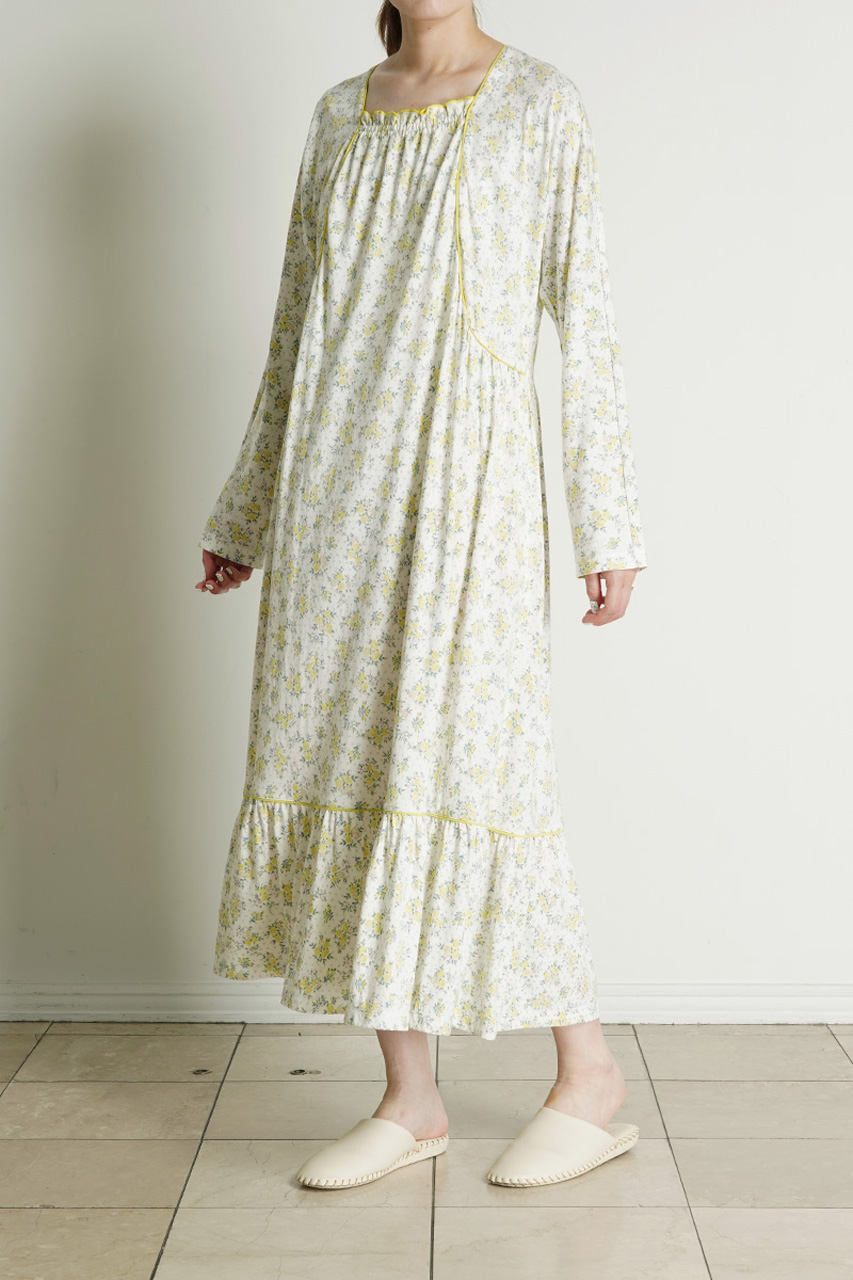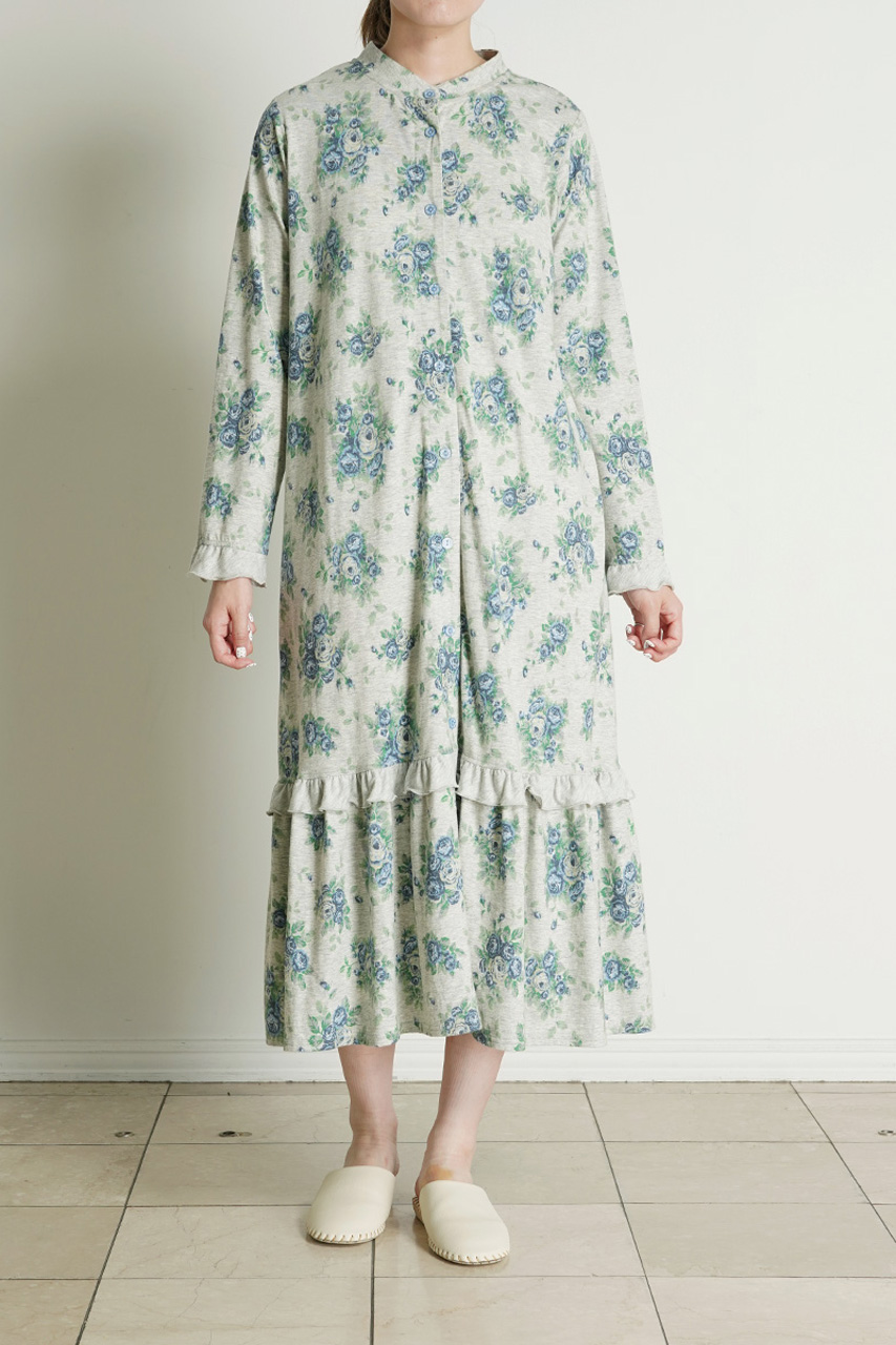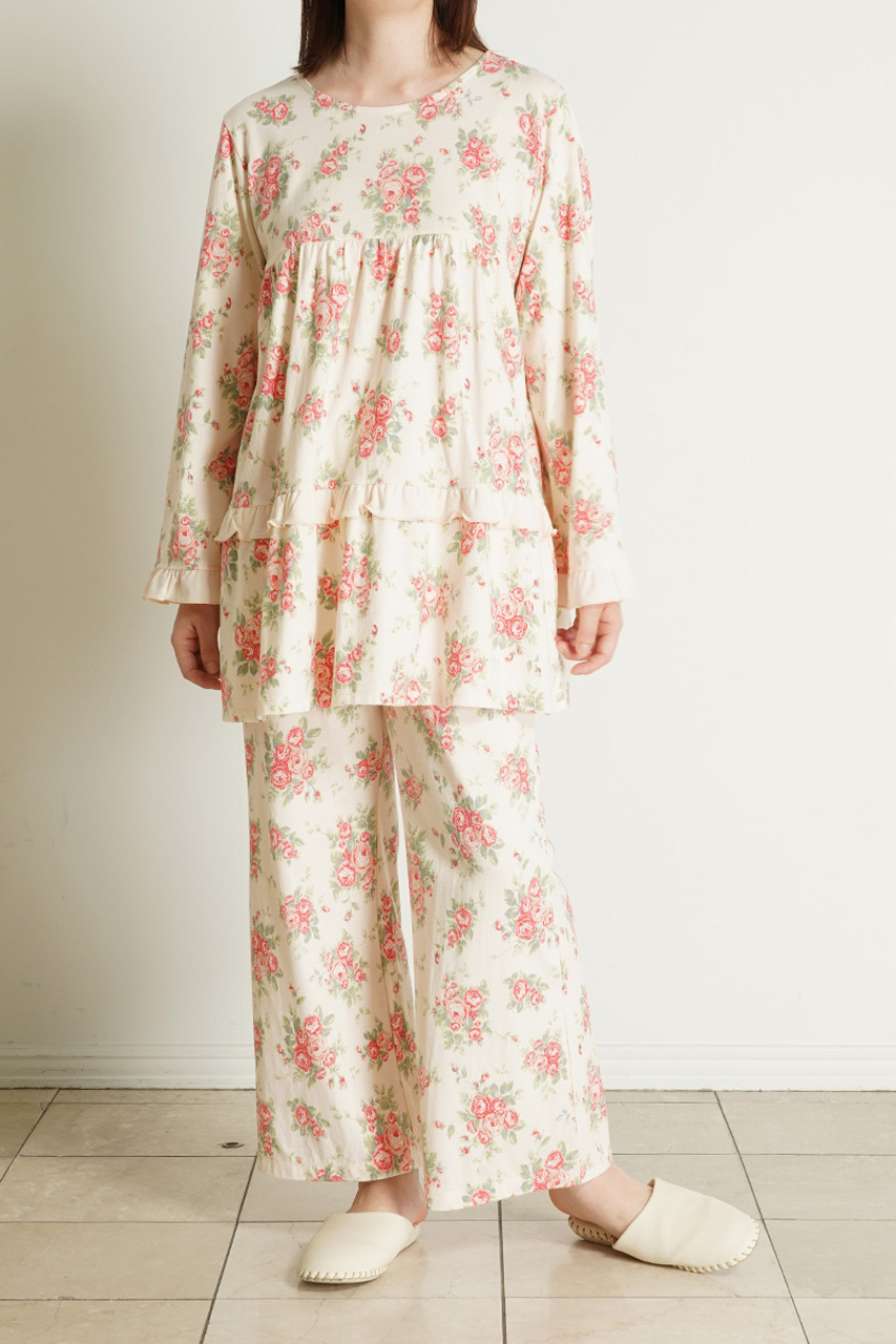 上品なタッチで描かれたオリジナルのローズブーケ柄が華やかなナイトウェアシリーズ。綿100%で仕上げたリラックス感のある優しい着心地。フリルをプラスし大人の甘さに。