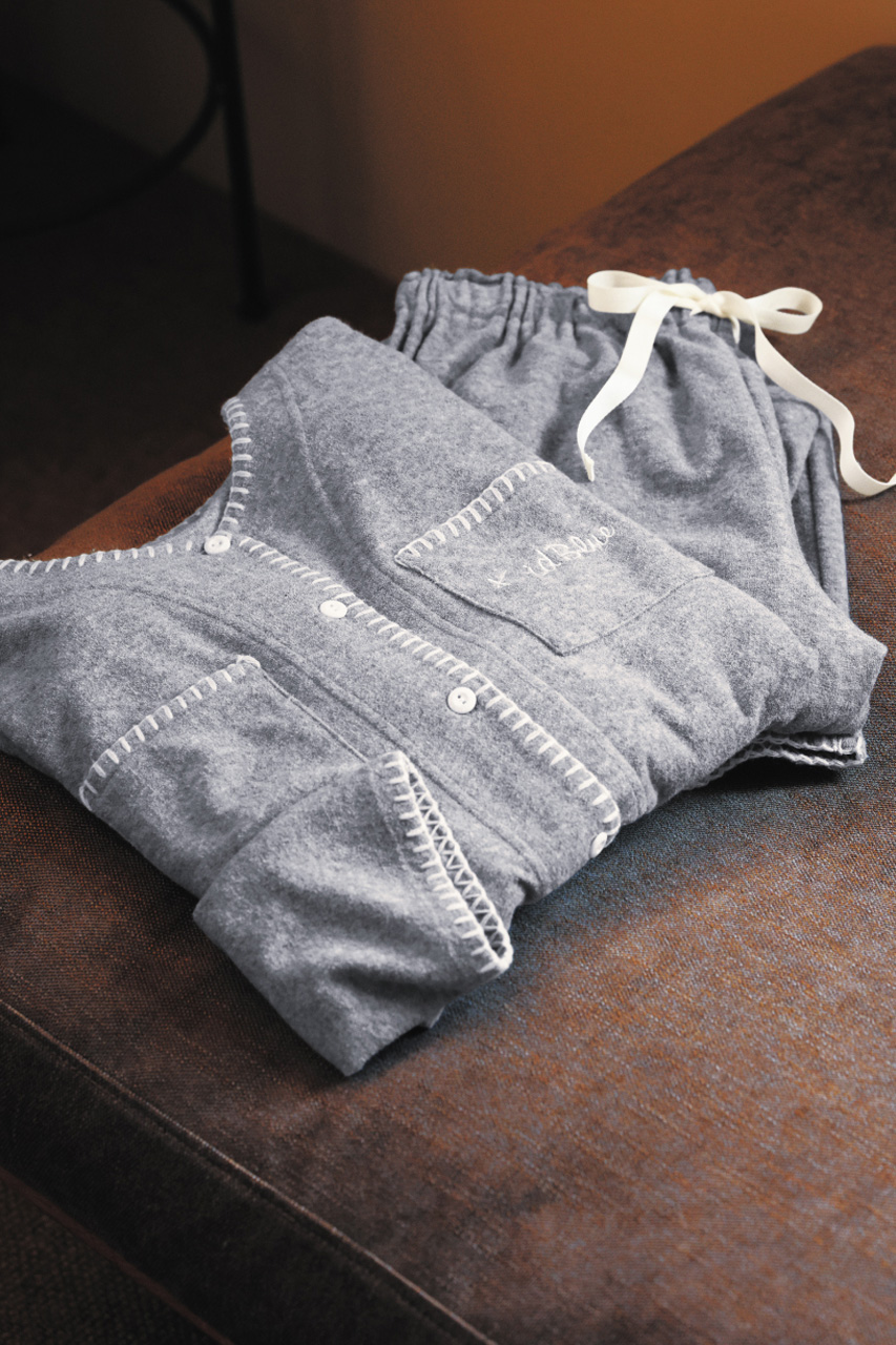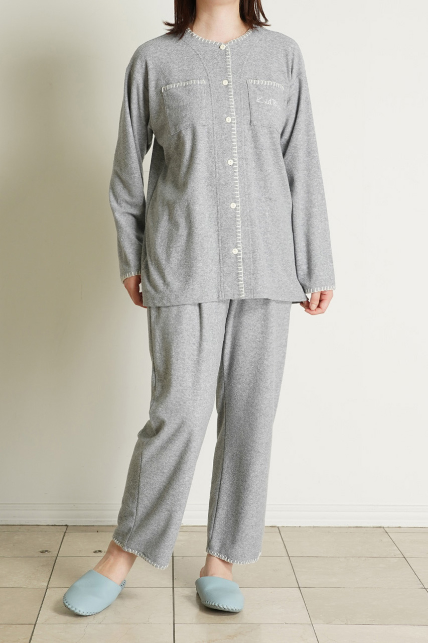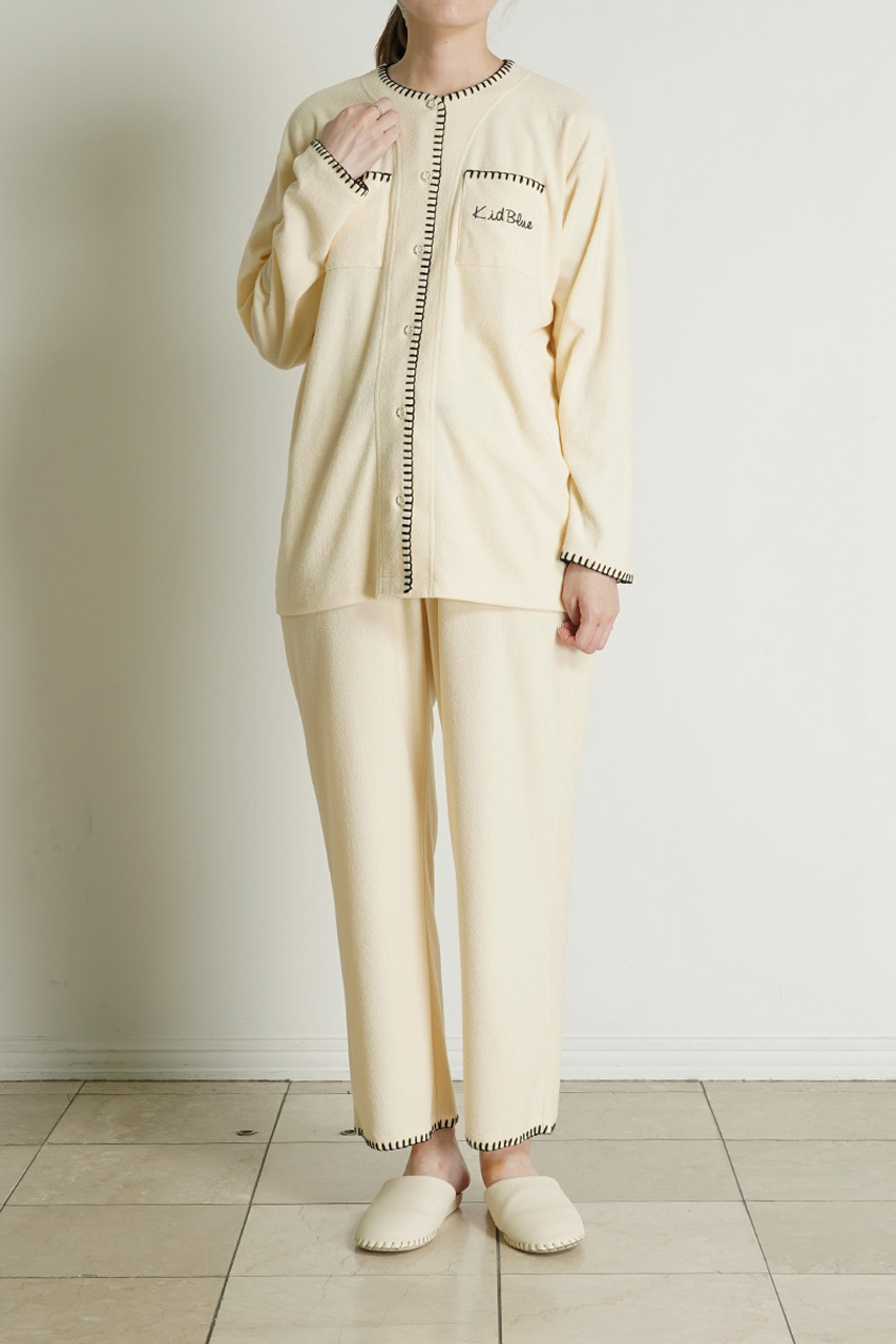 ブランケットステッチをあしらい、シンプルな中に遊び心のあるパジャマシリーズ。肌触りの良いコットン100%のパイル素材。