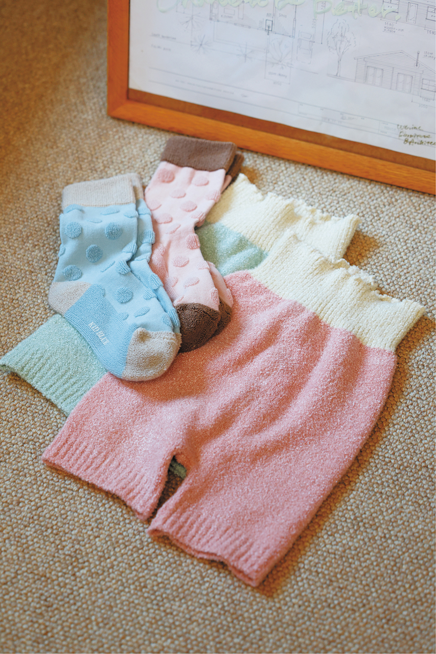 きれいなカラーのオーバーパンツとソックスは年代問わずに喜ばれるアイテム。ロングセラーのオーバーパンツはほど良い厚みで安心感のある着心地。立体感のあるドットが愛らしいパイルソックスは足元をやさしく包みます。