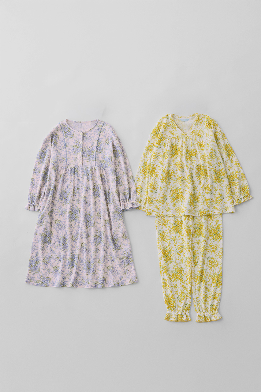 水彩画のように描かれたオリジナルミモザプリントが上品なリラクシングウェアシリーズ。ナチュラルな表情のあるワッフル地。ナイティは前立てのギャザー切り替えでかわいらしく。トップスはすっきりした首元にピコットの縁取りがポイント。ナイティ、トップス共に袖はゴム入りのパフスリーブでまくりやすく実用性もバッチリ。裾絞りシルエットのパンツはギャザーでかわいらしい印象に仕上げました。