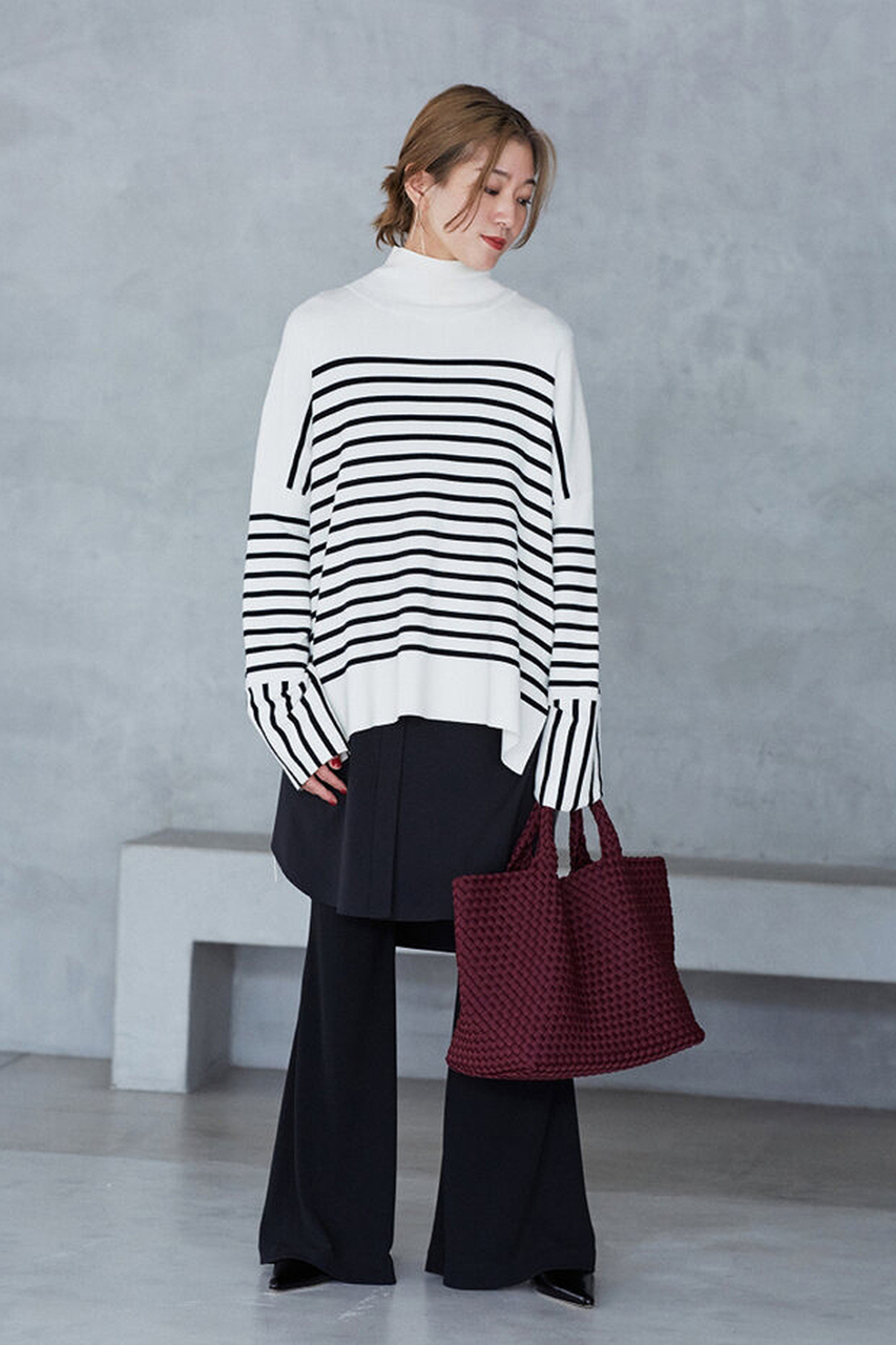 きれいめな合繊素材で仕立てた、大人のためのボーダーニット。
