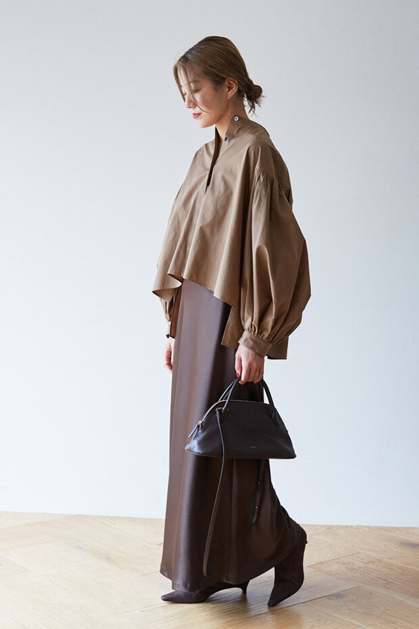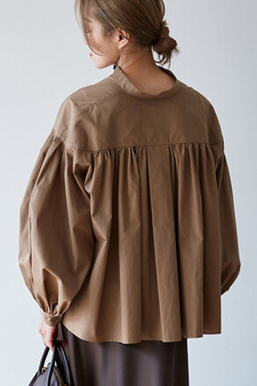 ボリュームスリーブや目を惹く後ろのギャザーが、オーセンティックなアイテムだけど印象に残るデザイン。