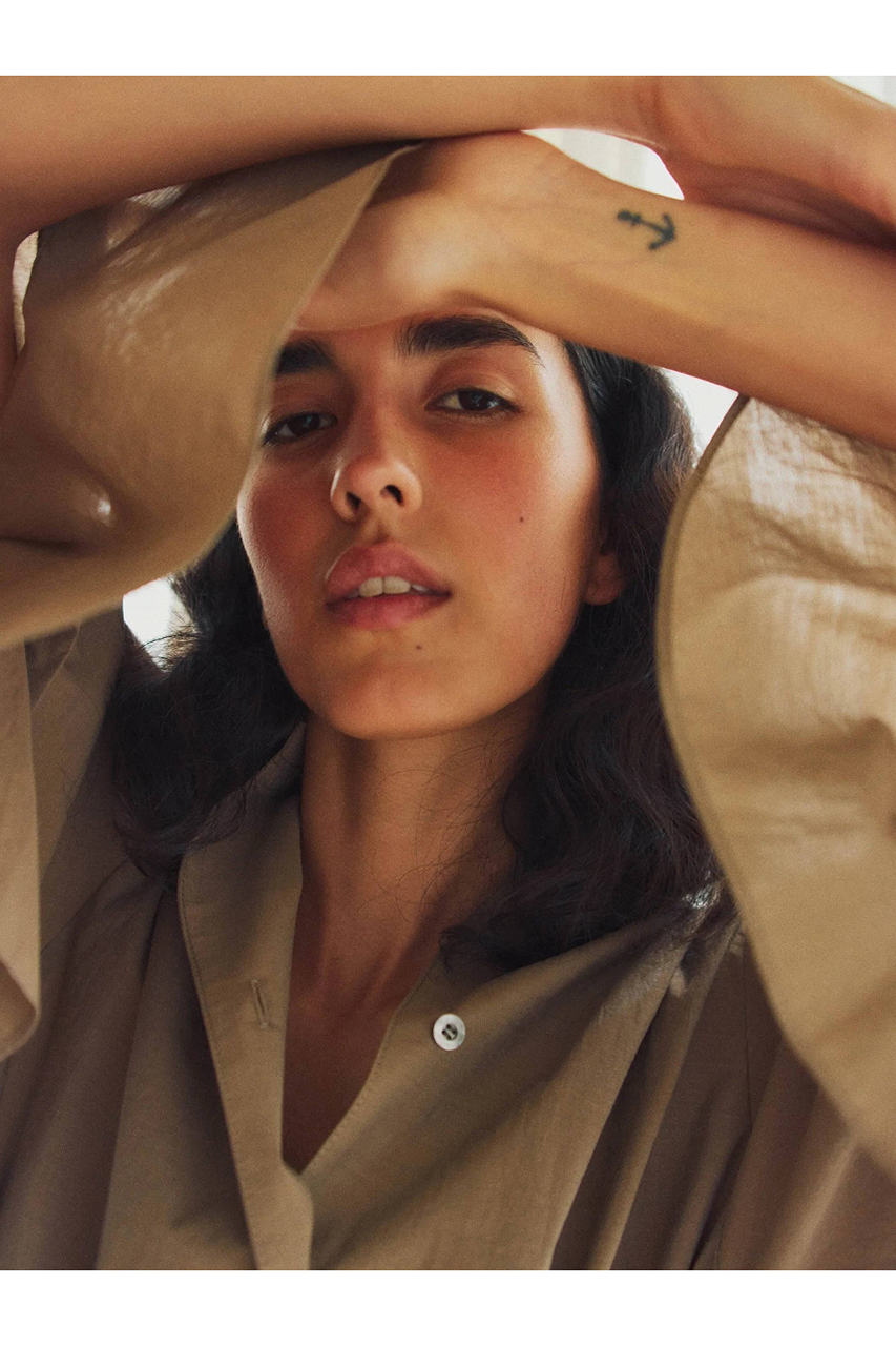 清涼感のある綿ナイロン素材に、ナチュラルなワッシャー加工を施した、これからの季節にぴったりのシャツドレス。