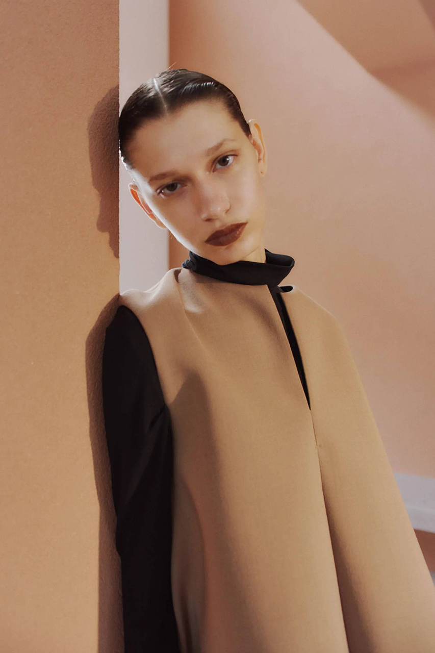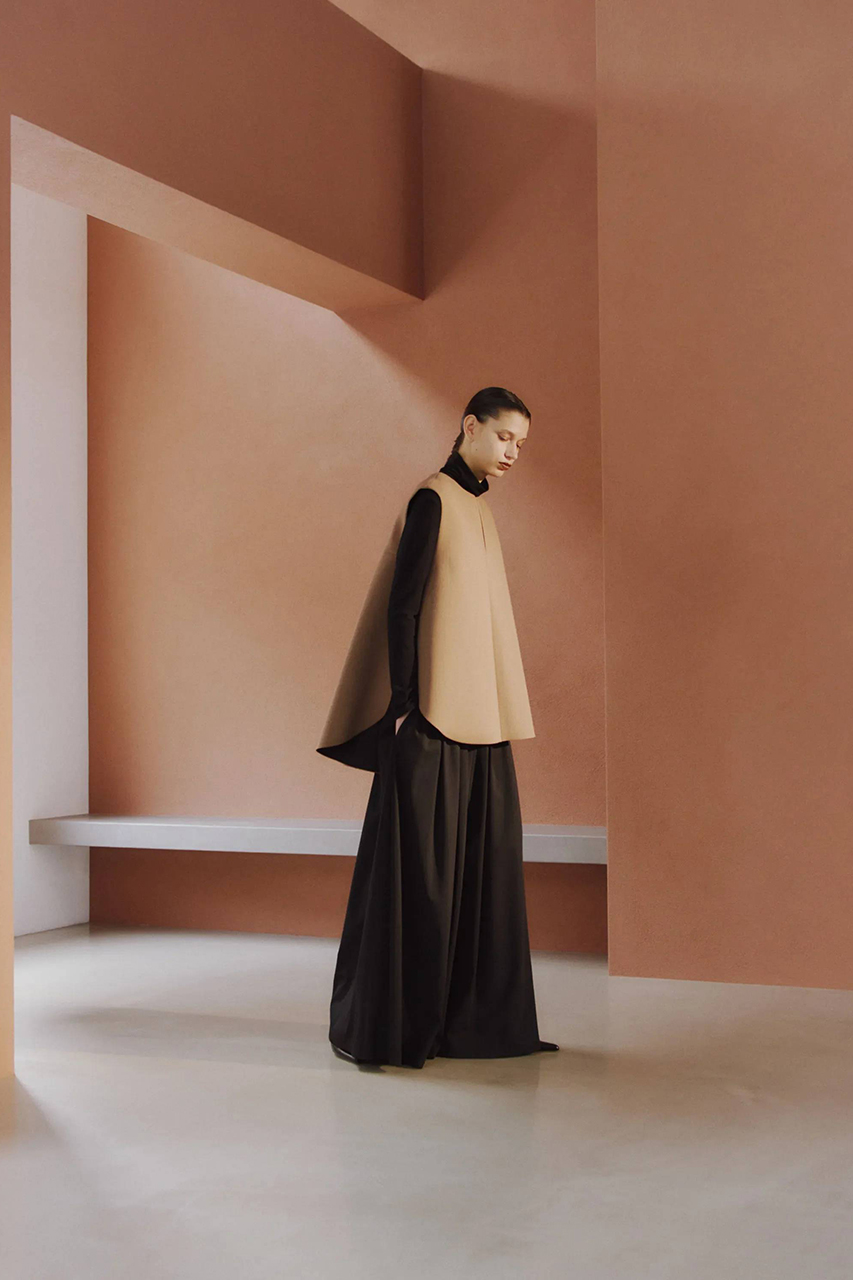 一見シンプルながらも、計算された前後差のある丈感と立体的なシルエットがレイヤードスタイルに奥行きをプラス。