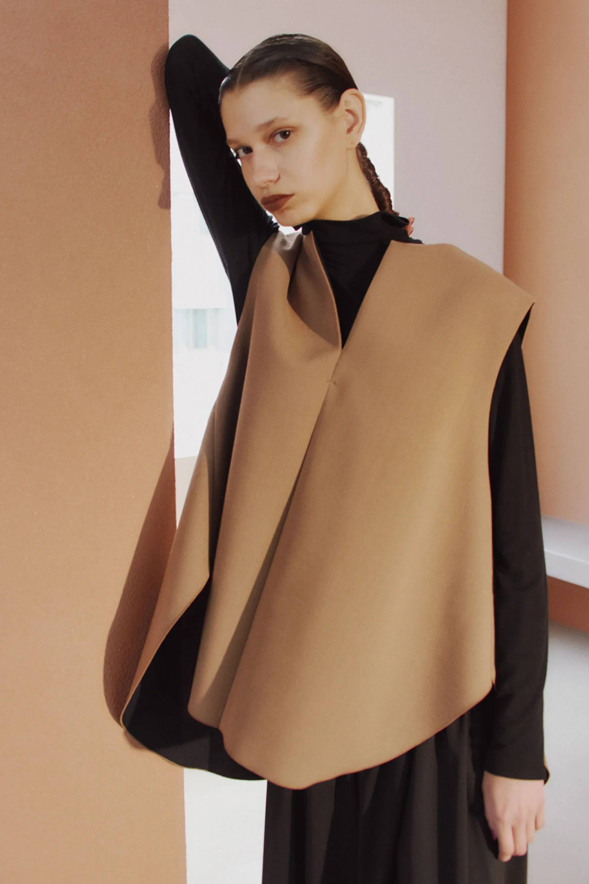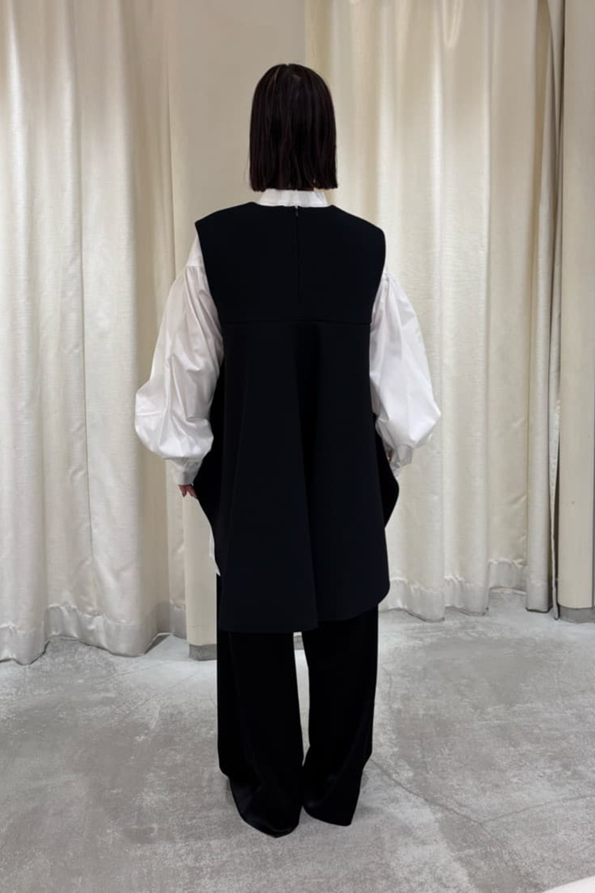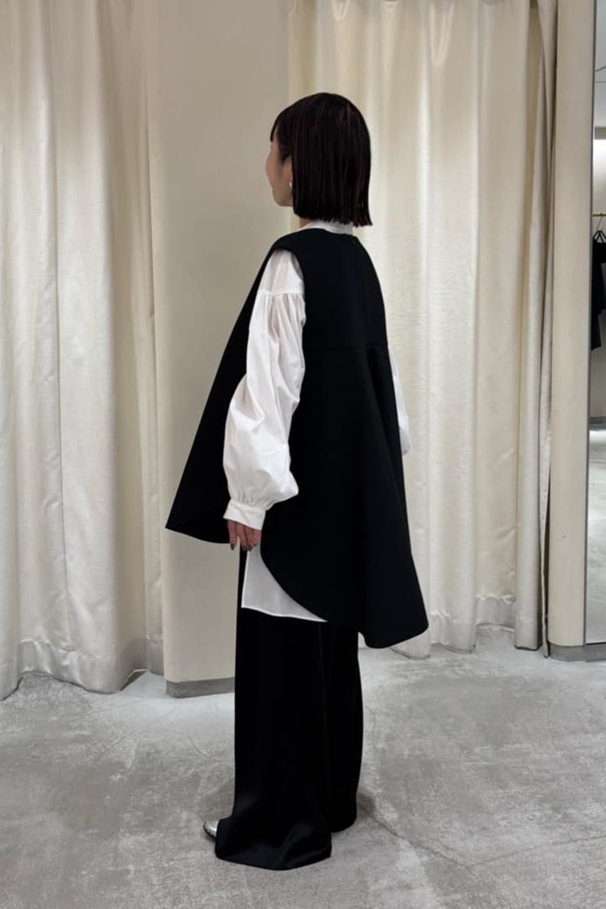 ボンディング素材特有の立体感を活かし、流れるようなラインとシルエットにこだわったジレ。