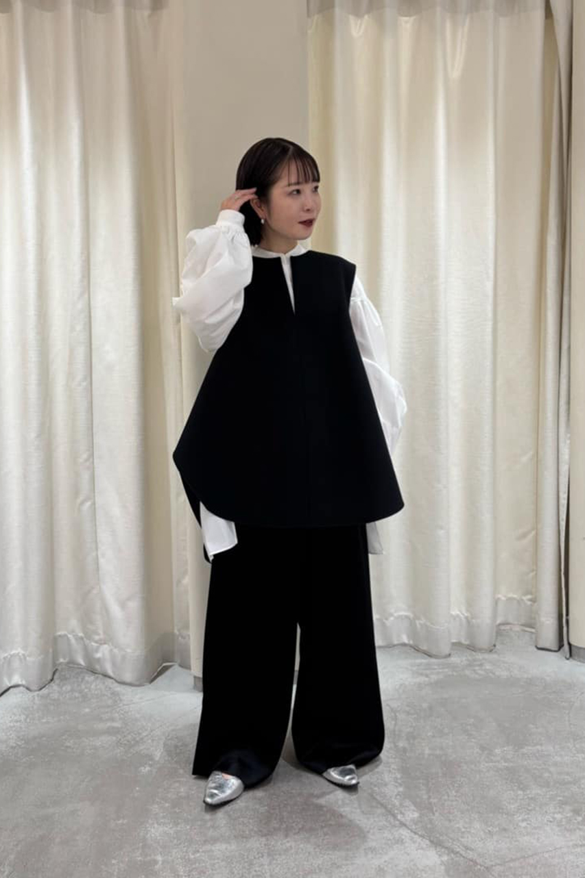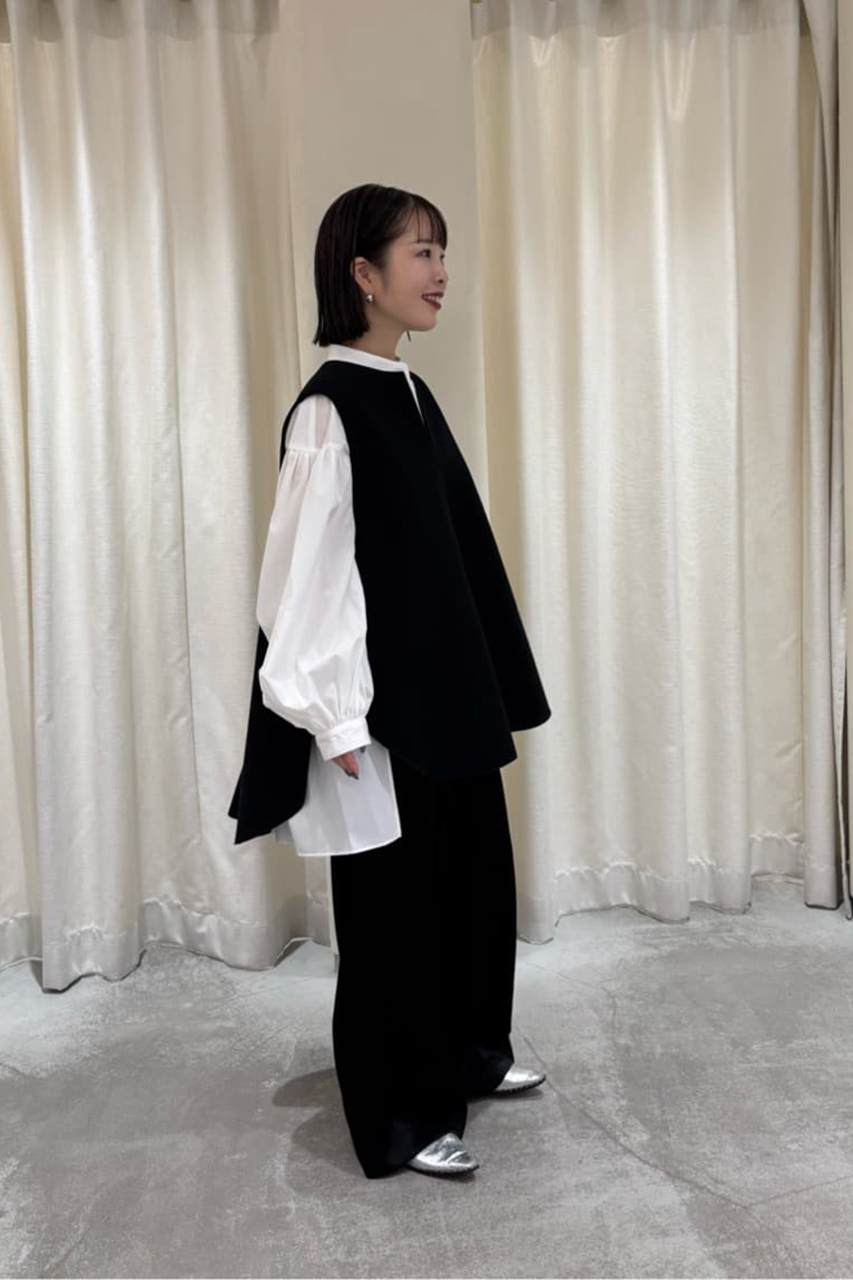 一見シンプルながらも、計算された前後差のある丈感と立体的なシルエットがレイヤードスタイルに奥行きをプラスしています。