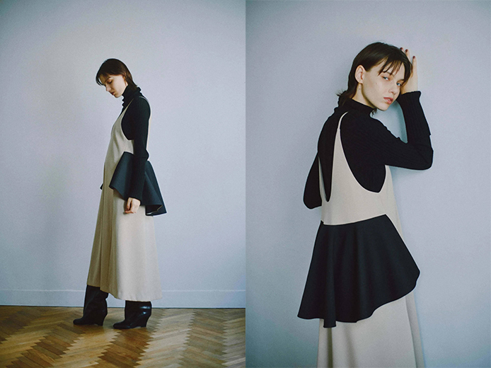 ウエストに揺れるペプラムディテールがアクセントになった、モードでフェミニンなジャンパースカートをご紹介