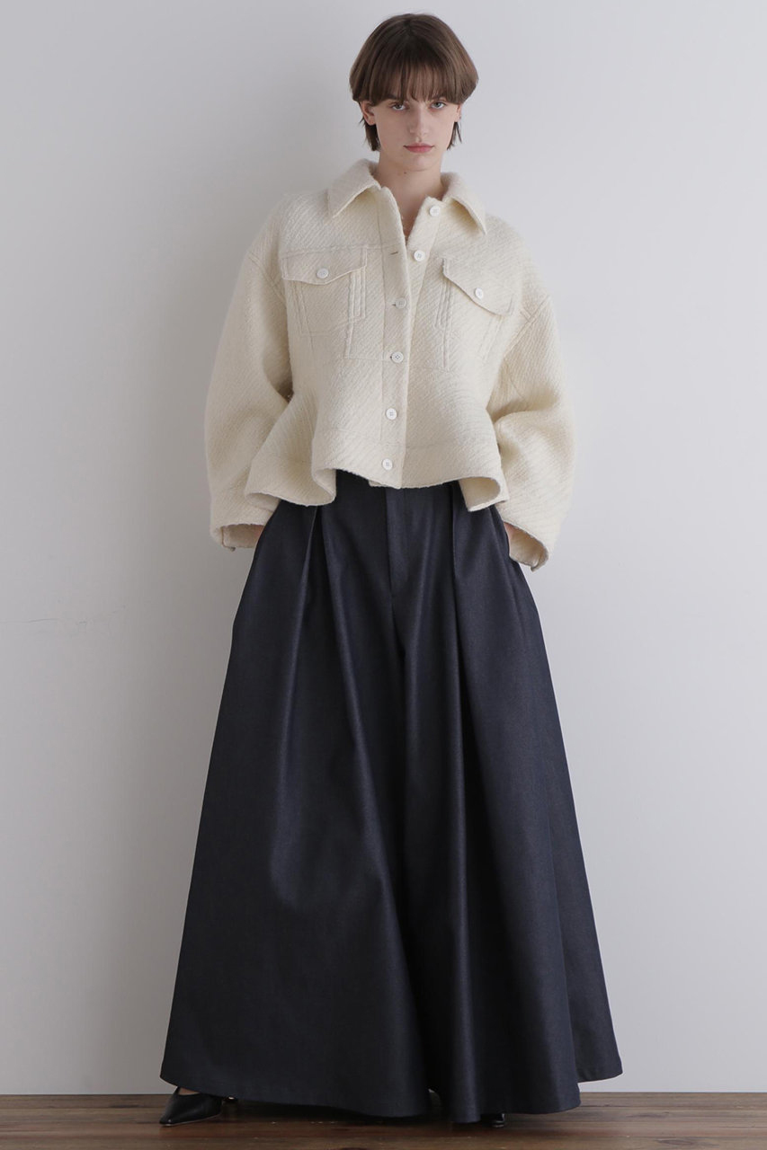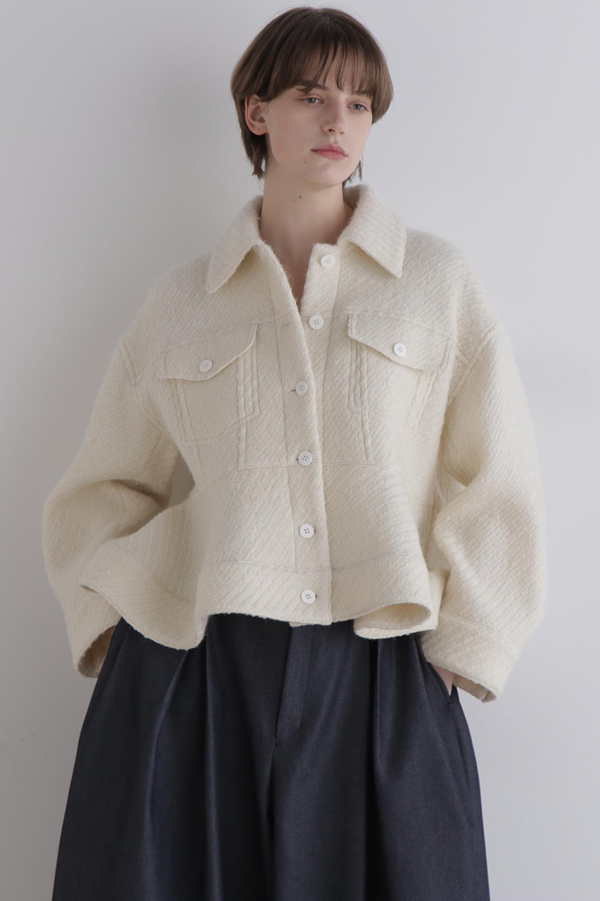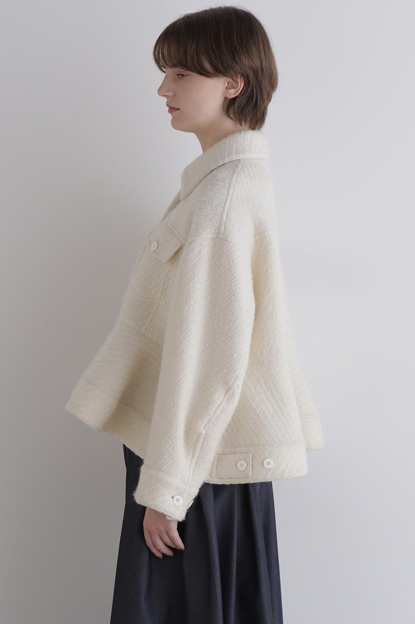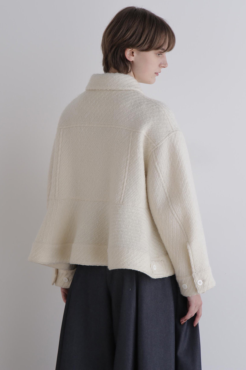 纏うだけで気分が高まる、クリーンなホワイト一色の展開。ふっくらとしたロービングウールならではの優しい風合いが、構築的なシルエットに柔らかな表情をプラス。