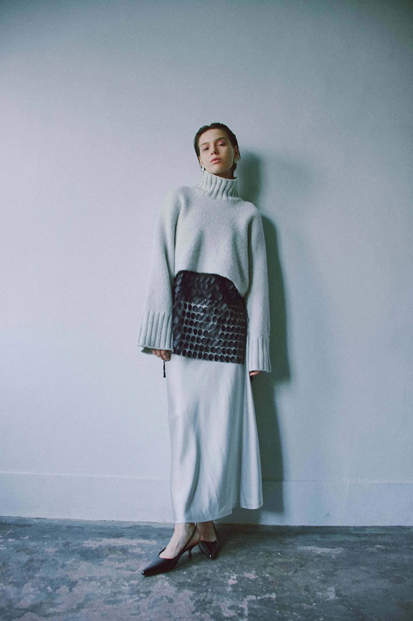 全体を縦ラインでまとめ、大きめのタートルでボリュームを持たせたスタイルアップされたシルエット。
