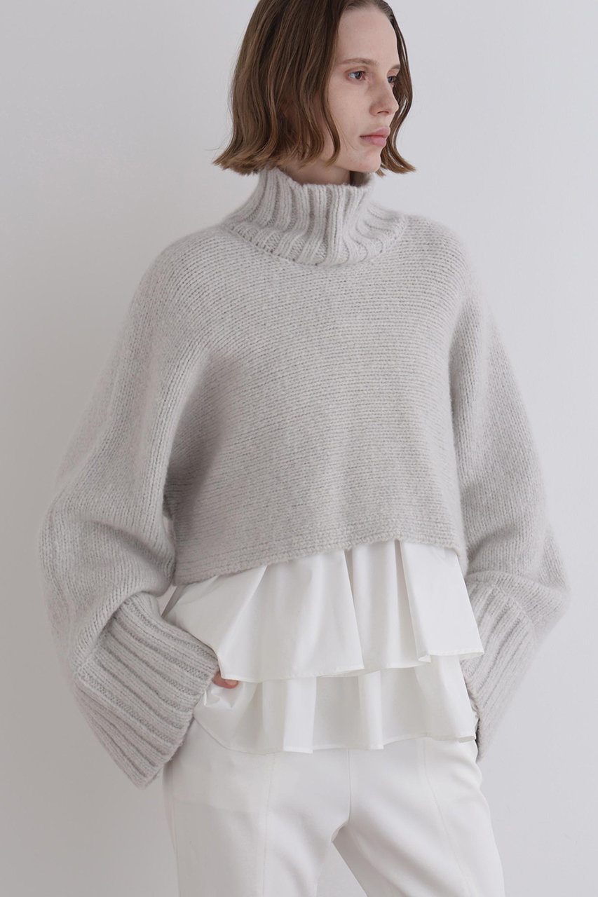 ゆったりとしたシルエットと短めの丈が大人のコーディネートをきれいにまとめるタートルネックショートプルオーバーをご紹介