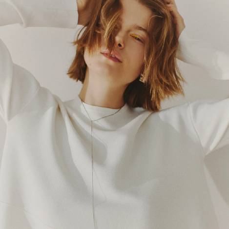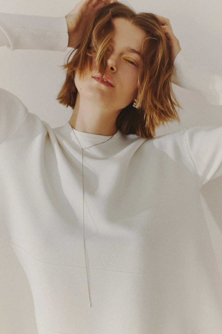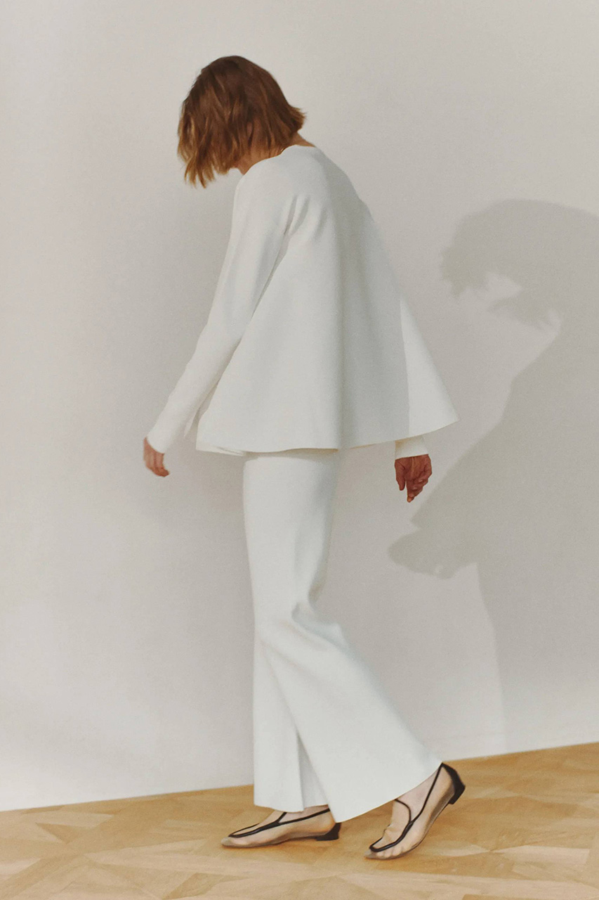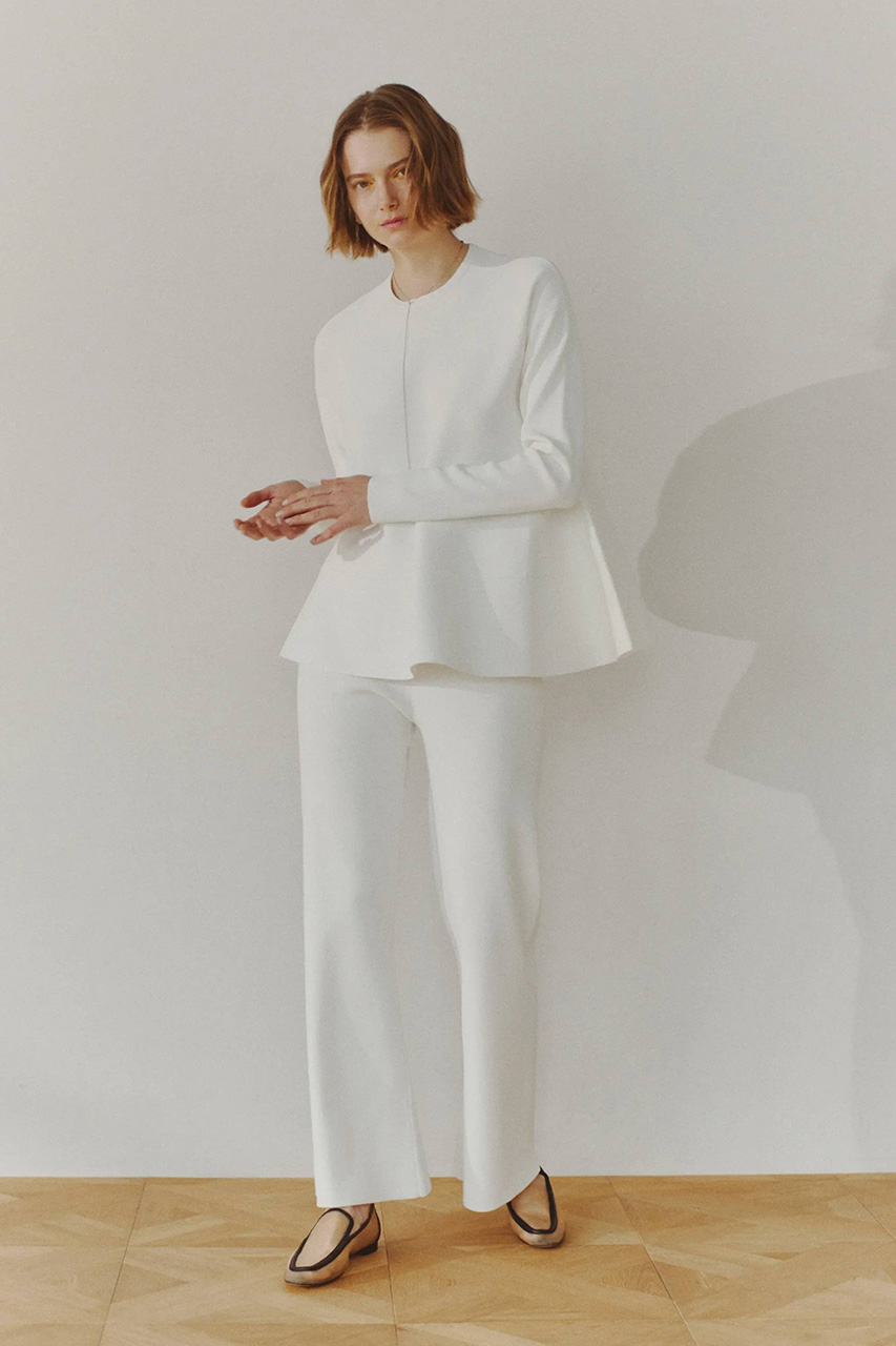 シンプルな佇まいの中に、裾に向かって広がるフレアシルエットが立体感をもたらすニットプルオーバー。