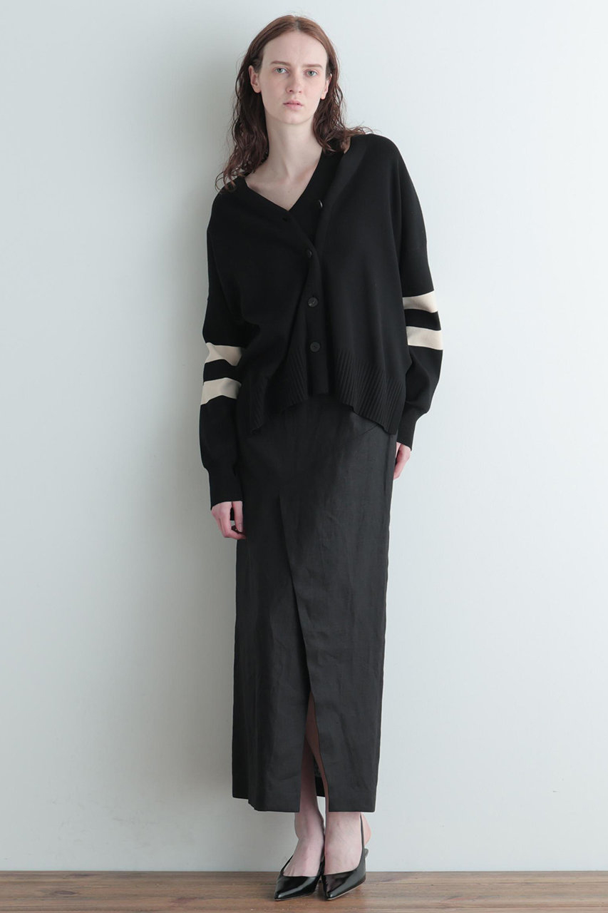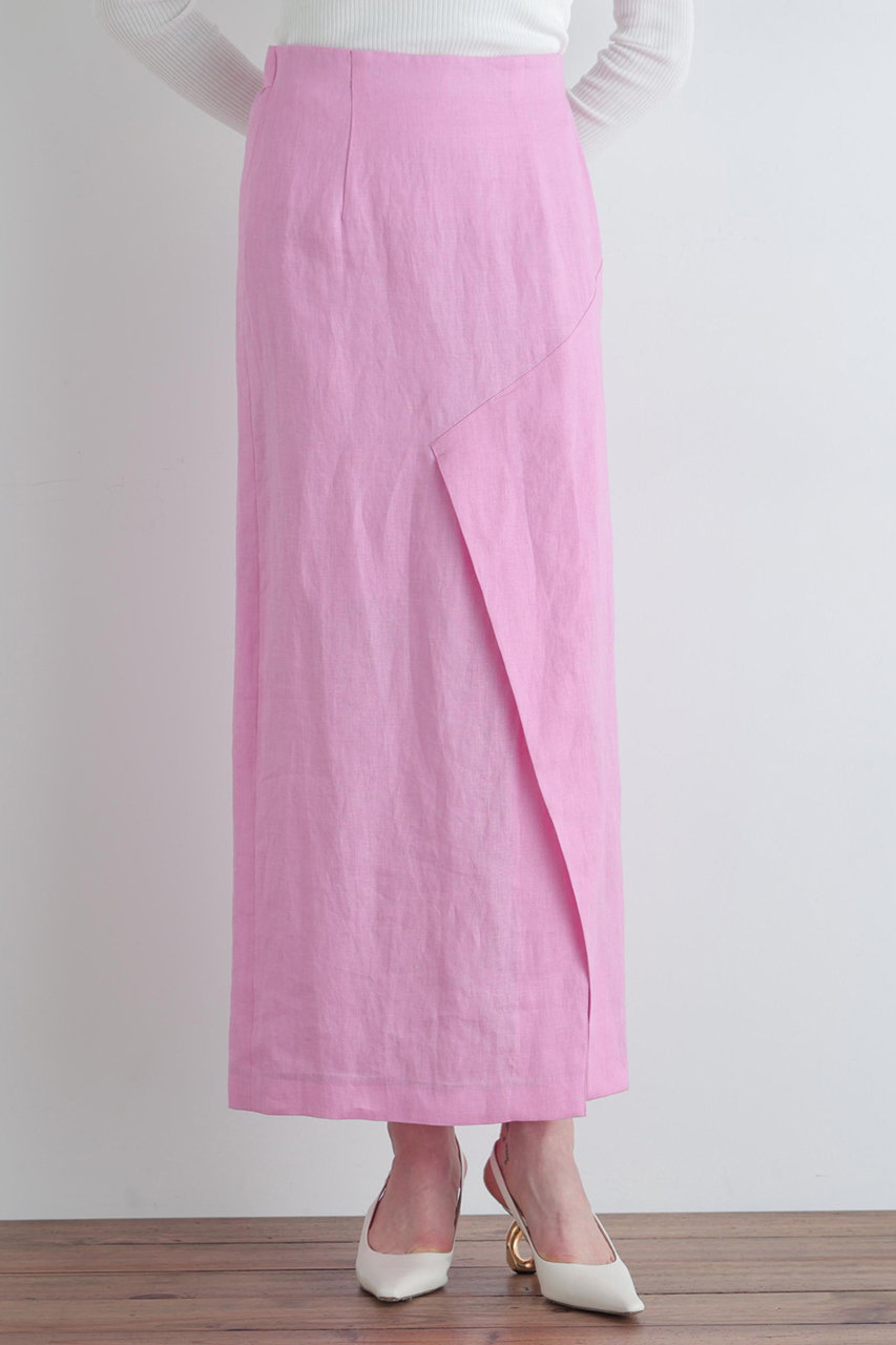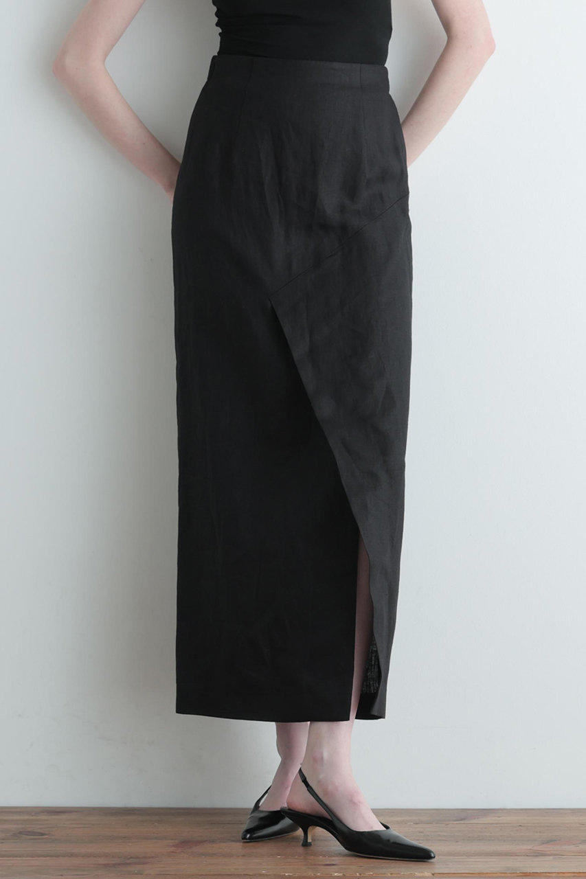 高揚感のあるカラーがポイントのリネン素材を使用したすっきりとしたシルエットのマーメードスカートです。 大胆に高い位置から入ったベントスリットが特徴ですが、スリットが開いて足があらわにならないお作りになっています。
