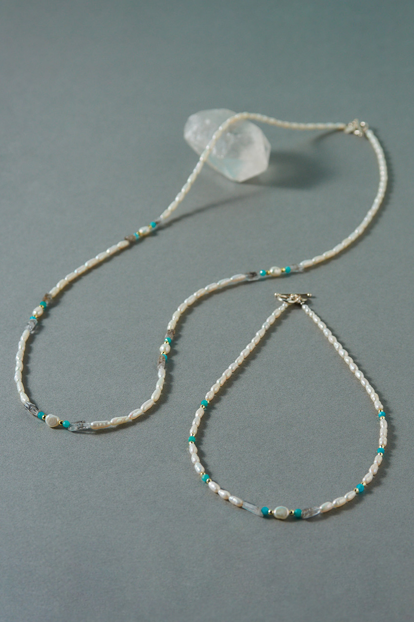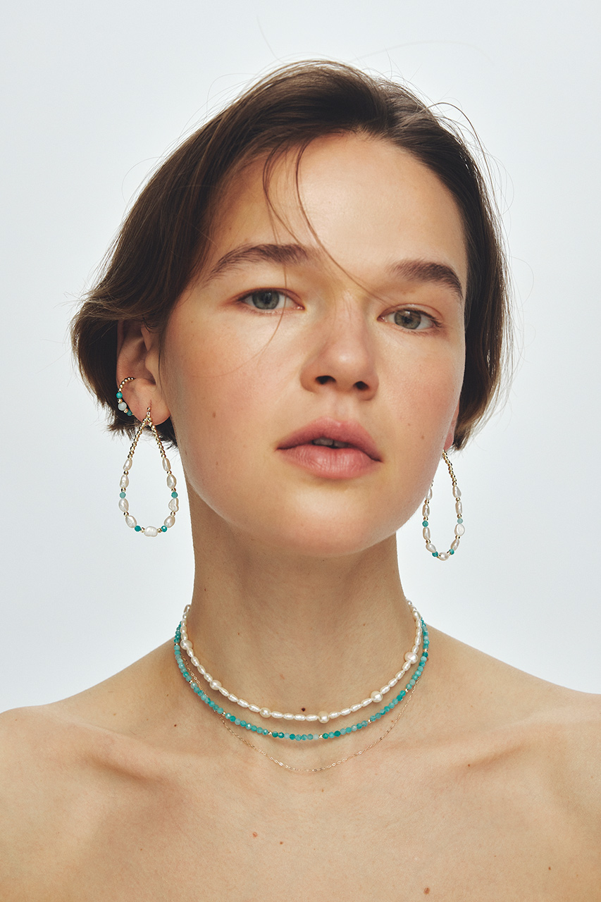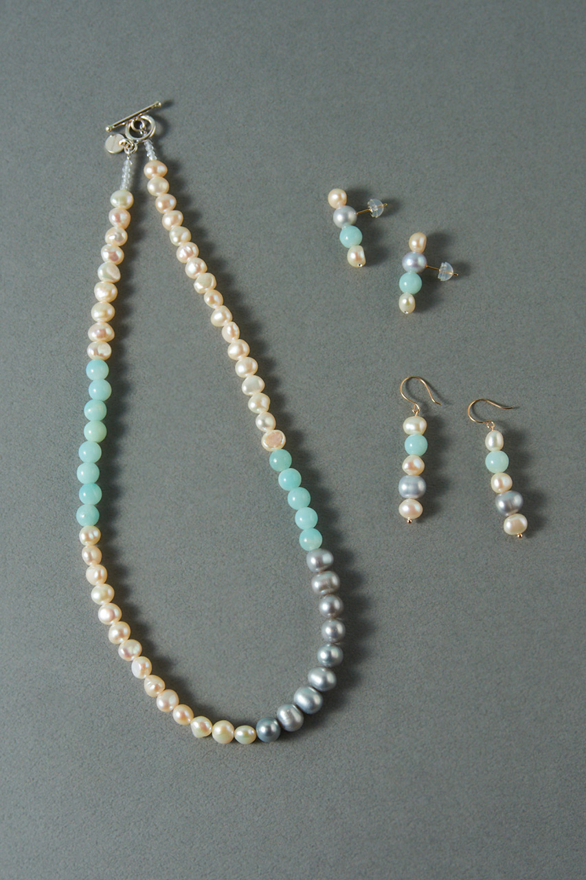 洞窟内から見える海の青さにインスピレーションを受けた幻想的な美しさの天然石と淡水パール。表情豊かな淡水パールに、グラファイトやアマゾナイトなど幻想的な美しさがある天然石を合わせたデザインは、みずみずしい艶をたたえ、品のよさと神秘的なムードをもたらします。