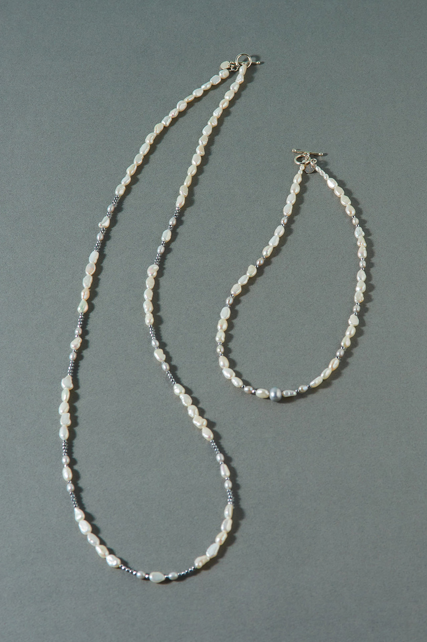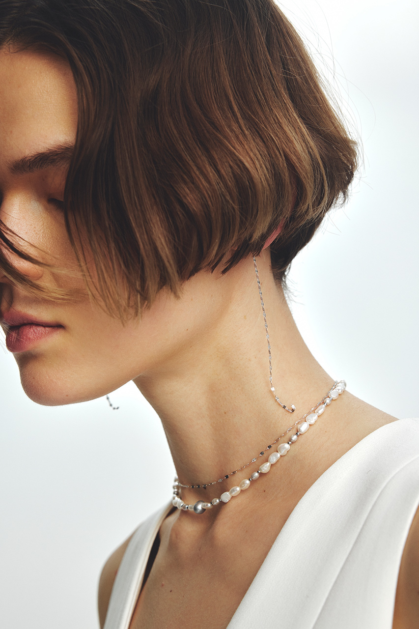 ヘマタイトの強さと淡水パールの柔らかさ。質感のコントラストにより、モードな雰囲気が叶うアイテム。すらりとした佇まいとシックなグレーパールを用いた緊張感のある配色が、纏う人の魅力を引き立てます。ホワイトゴールドのK10ネックレスとの組み合わせは、モノトーンのコーディネートにも、奥行き感が欲しい時にも重宝します。