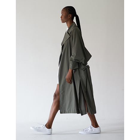 接触冷感・UVカット・2Wayストレッチの高機能なスポーツ素材を使用したトレンチコート。ワイドなボディと袖は肘までたくし上げられるよう極端に細身にしているのが特徴です。身頃の幅が広いので、インに着るトップスの袖のデザインを問わず羽織れます。ネイビーはメンズモデルの着用イメージで、ジェンダーレスにも着こなせるアウターです。