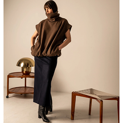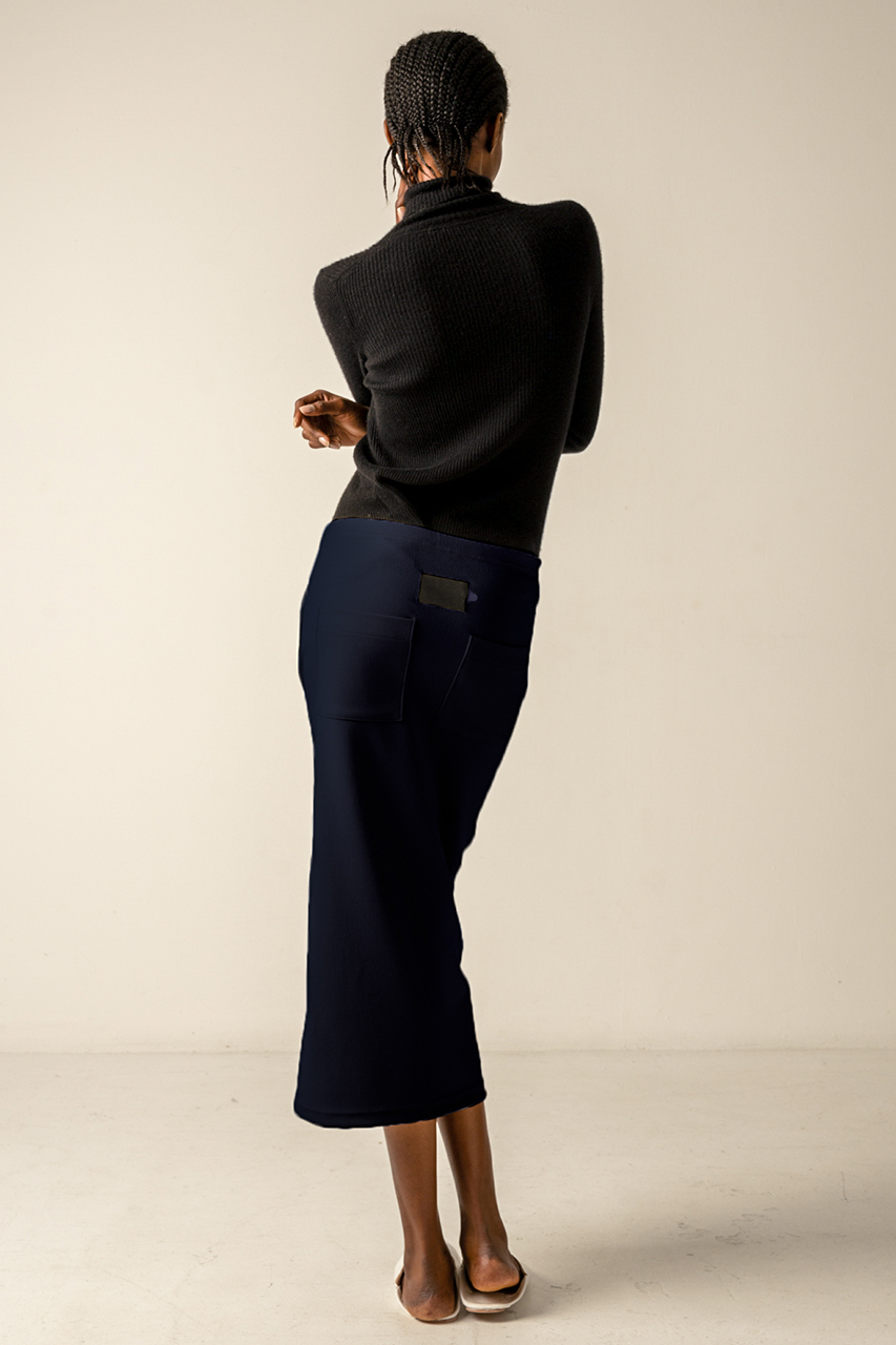 定番人気のペンシルスカートは、布帛のようなきれいめな印象の適度なハリと反発感のある素材で登場。ドローストリングでウエストを調節し、サイドのラインが少し前にくることでスリムな印象に。ヒップ部分の低めのパッチポケットが、カジュアルな印象を与え、気軽にデイリーユースできそう。