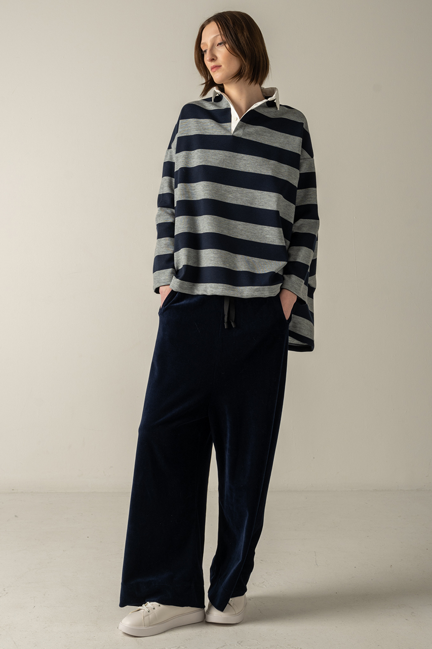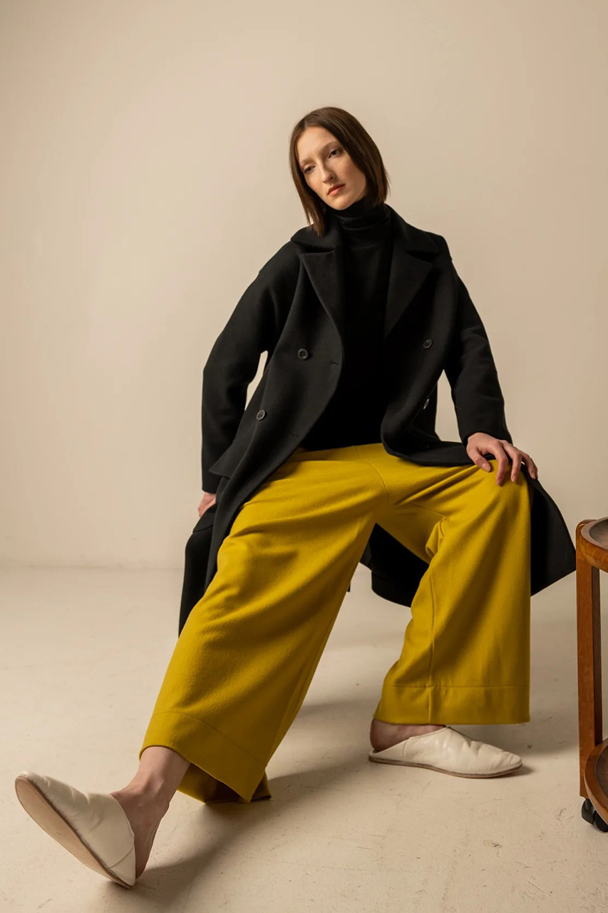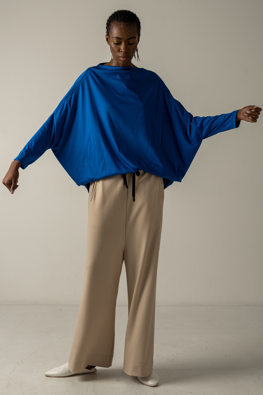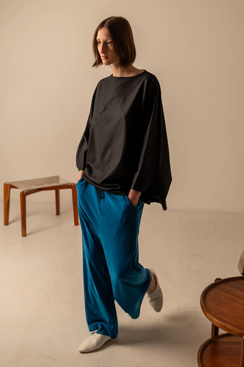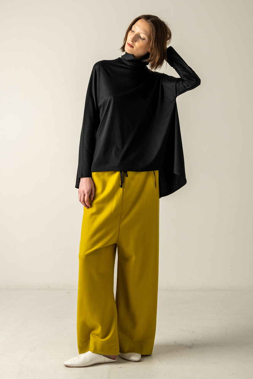 リラックス感とやや股上の深いモードな雰囲気を兼ね備えた人気のトラウザーパンツ。ウールタイプとベロアタイプの2種ご用意。締め付けのないウエストドロストで快適なはき心地をキープ。股上をかなり深めに設定し、ウエスト位置の調整で、さまざまなレングスが楽しめます。腰周りがすっきりとして落ち感もよく、華奢見えするため、ワイドトップスとも相性抜群。