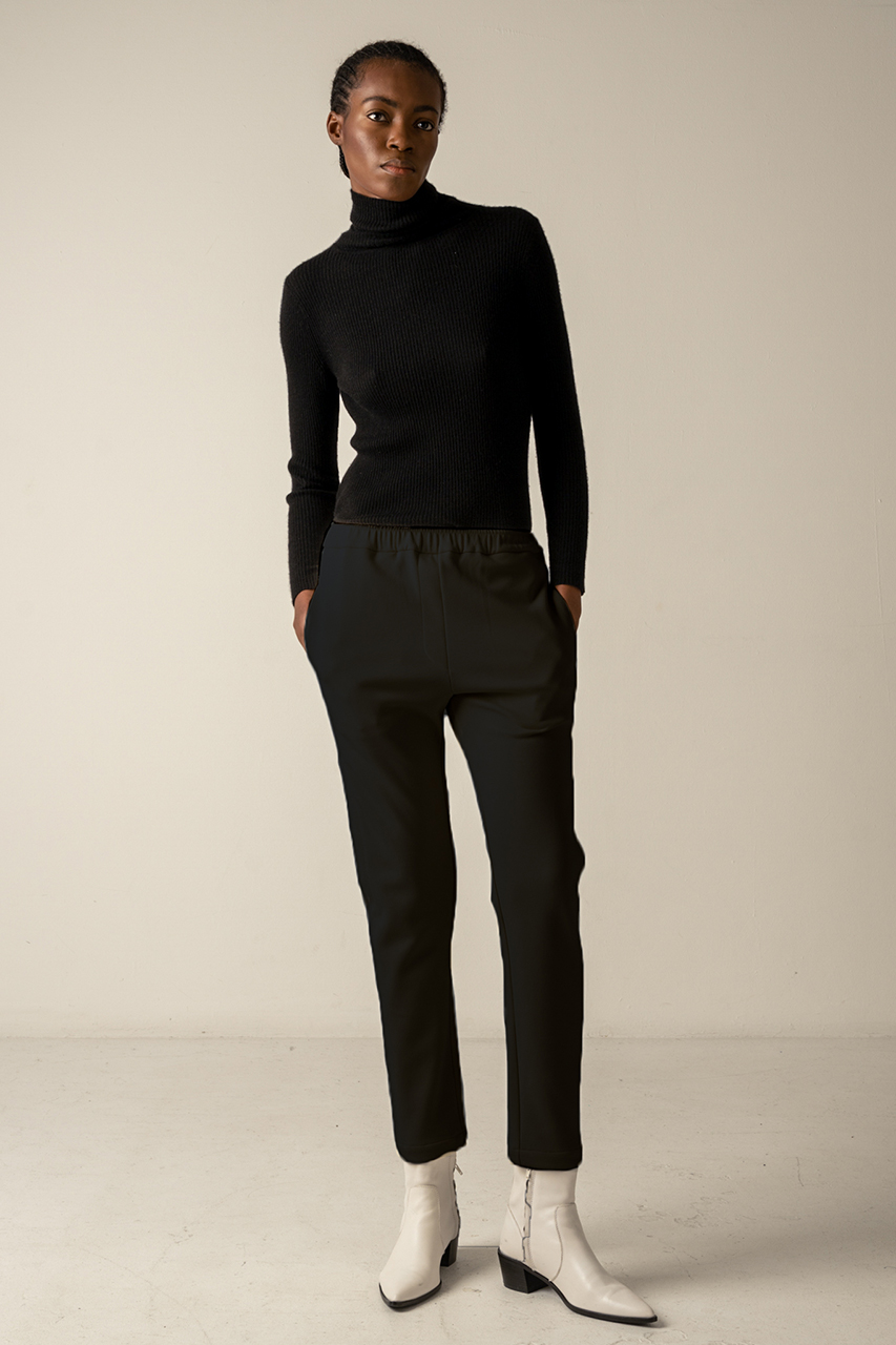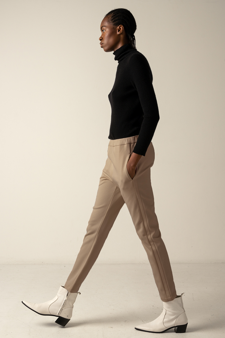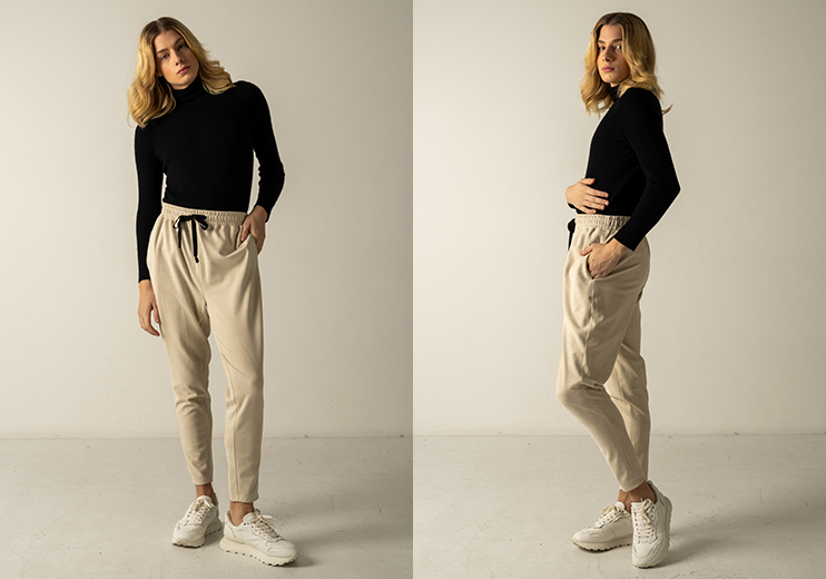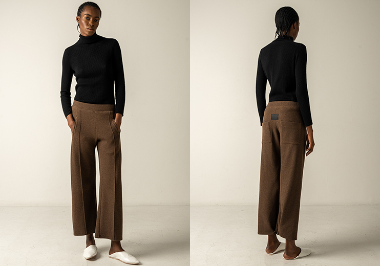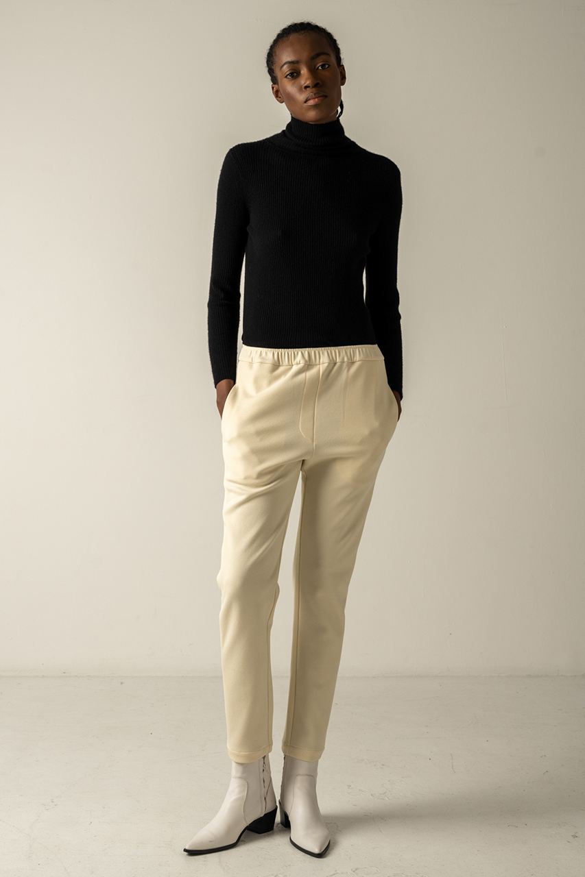 レギンスとパンツの中間のようなシルエットで、幅広い着まわしに重宝するトラウザーパンツ。「コグ ザ ビッグスモーク」の中では細身ながら、脇線に接ぎがなく、ドロストウエストで、締め付けのないはき心地を実現。リサイクルポリエステルを使ったサステナブルなスウェード風マイクロコーデュロイ組織の素材を用いた、あたたかくとてもソフトな肌触りが手放せない。