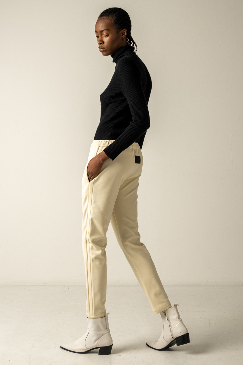タキシードパンツにインスパイアされた側章が縦ラインを強調し、シャープかつスマートに演出。布帛のような組織が適度なハリと反発感のある中肉素材を用いており、普段使いからオケージョンまでさまざまなシーンに活躍。