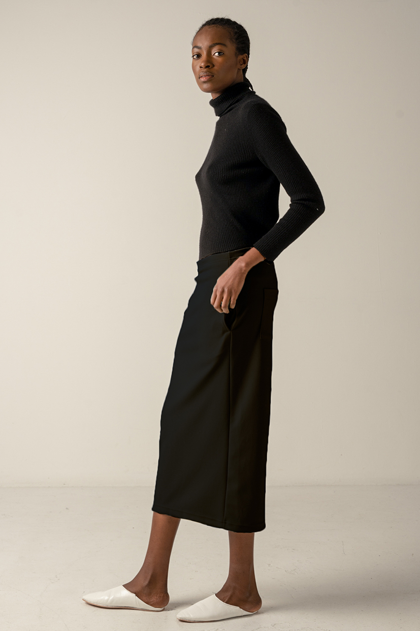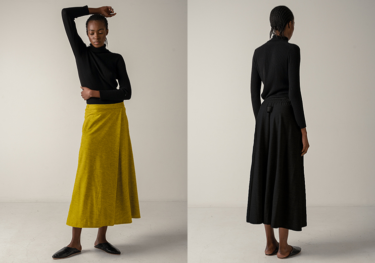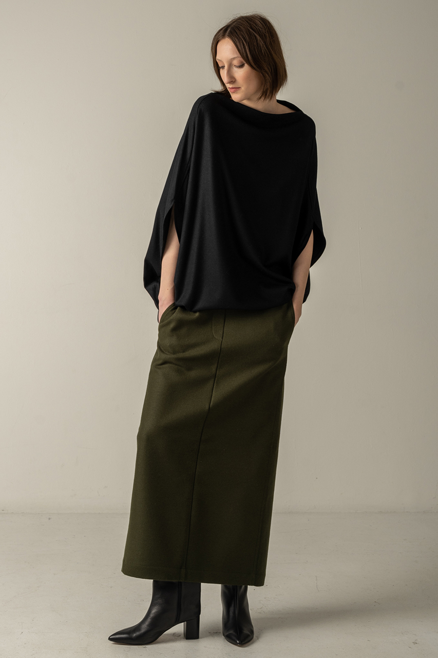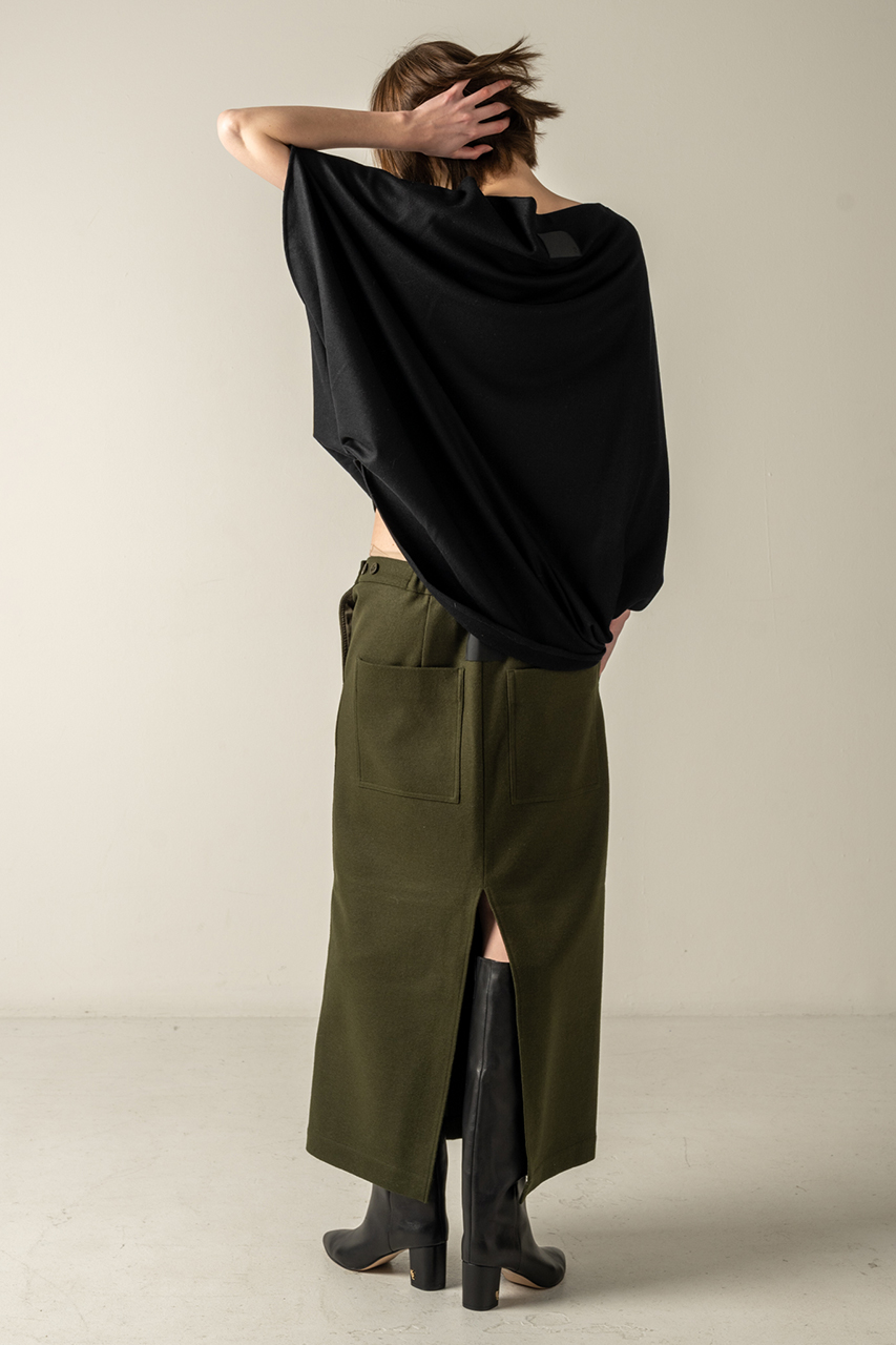 フェミニンなシルエットに、脇のジェットポケットがシャープな印象を添えるスカート。シルエットを美しく魅せる上品な光沢&適度なハリとなめらかな肌触りが味わえるミルド天竺が魅力。Aラインのマキシ丈でたっぷりとした裾の分量感ながら、ラップ風の大きなタックがウエスト周りをすっきりと演出。