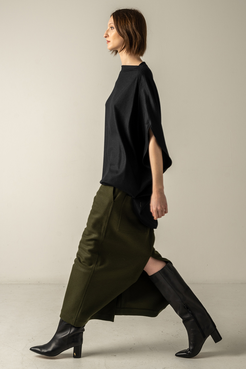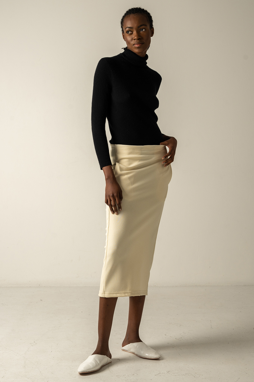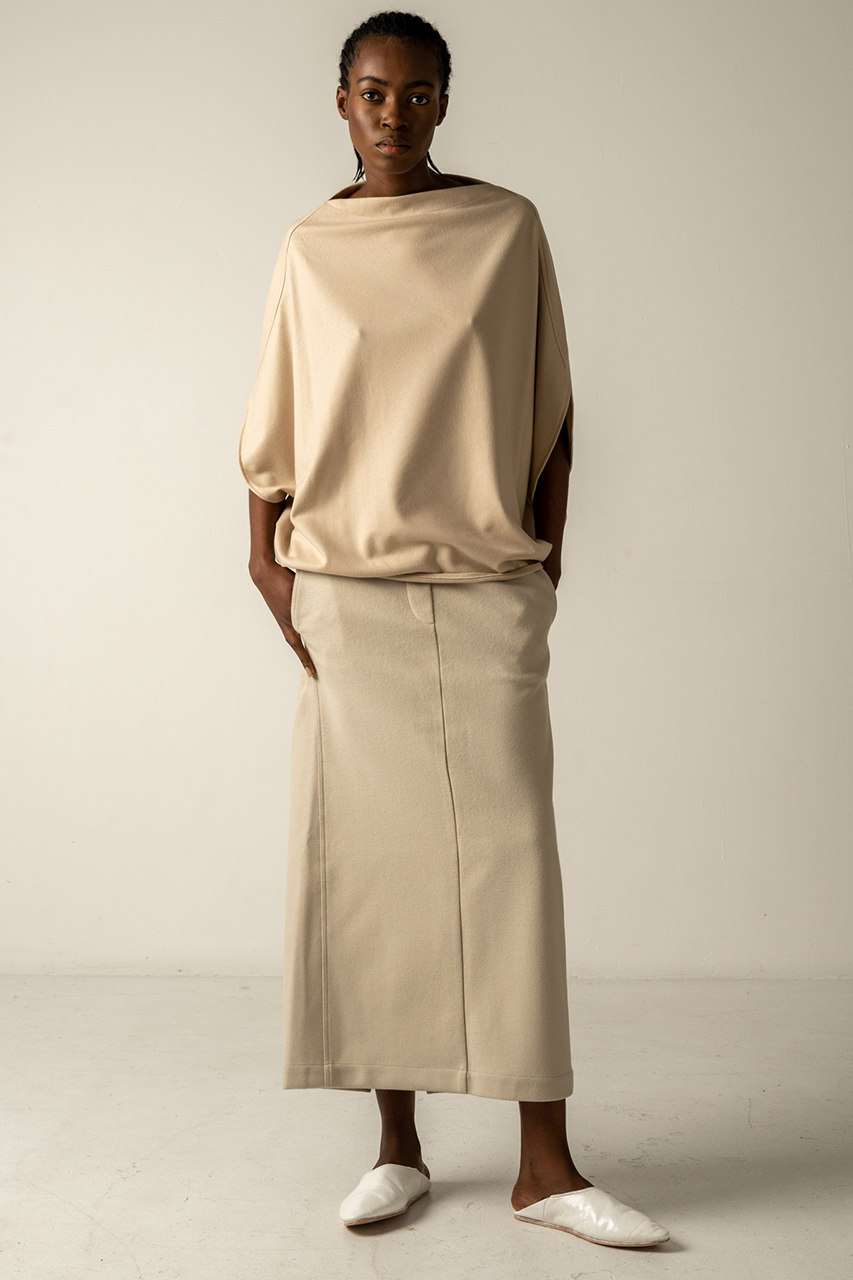 フェミニンなシルエットに、脇のジェットポケットがシャープな印象を添えるスカート。シルエットを美しく魅せる上品な光沢&適度なハリとなめらかな肌触りが味わえるミルド天竺が魅力。Aラインのマキシ丈でたっぷりとした裾の分量感ながら、ラップ風の大きなタックがウエスト周りをすっきりと演出。