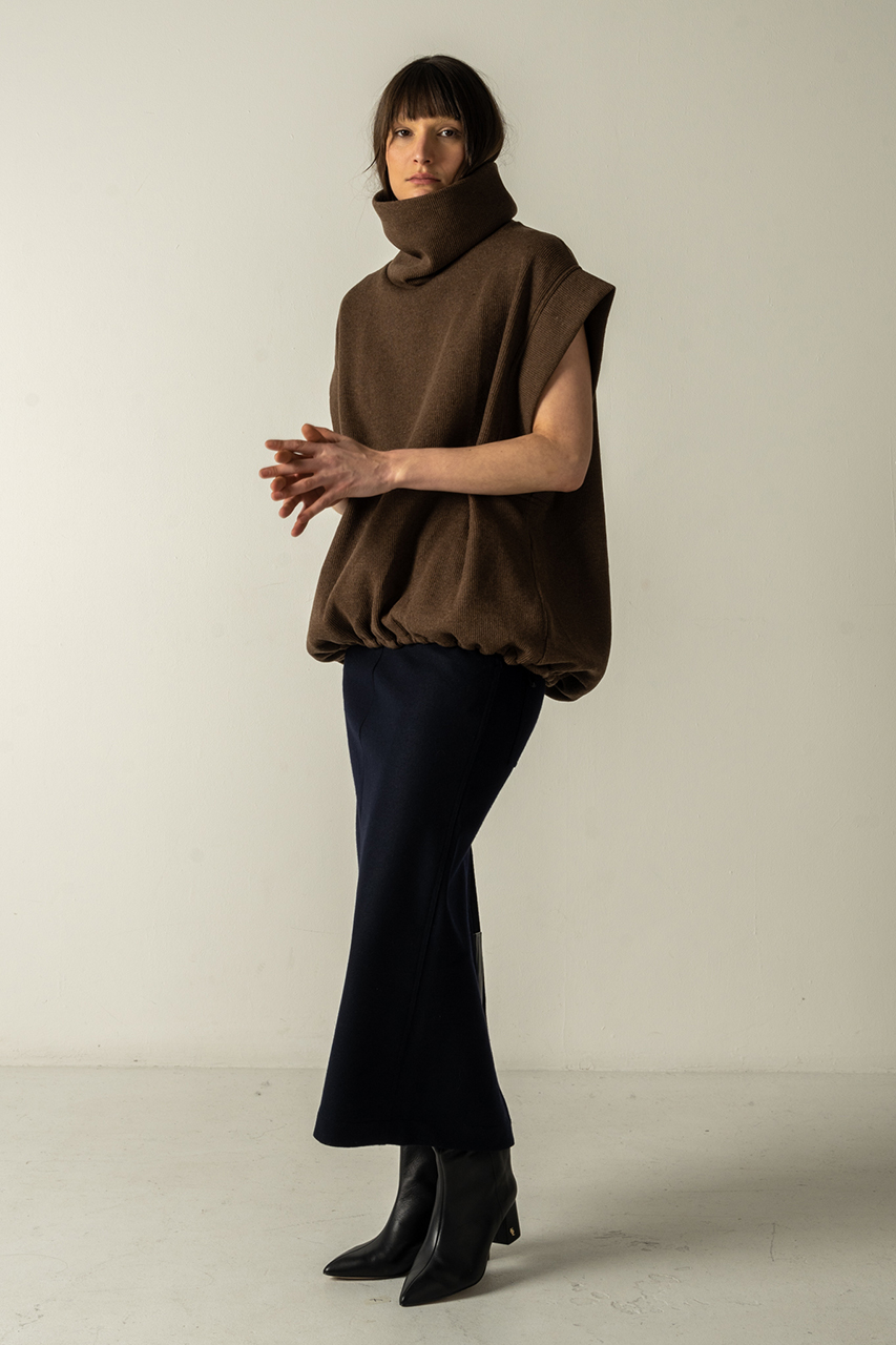 落ち着いた大人な雰囲気を醸し出すセミタイトフィットのロング丈ストレートスカート。布帛メルトンのような表情ながらも軽くて着心地のよい素材感が魅力の1枚。後ろウエストは締め付けのないゴムでリラックスしたはき心地に。脇の5段階に調節できるタブで、タック分量をお好みに調整可能です。