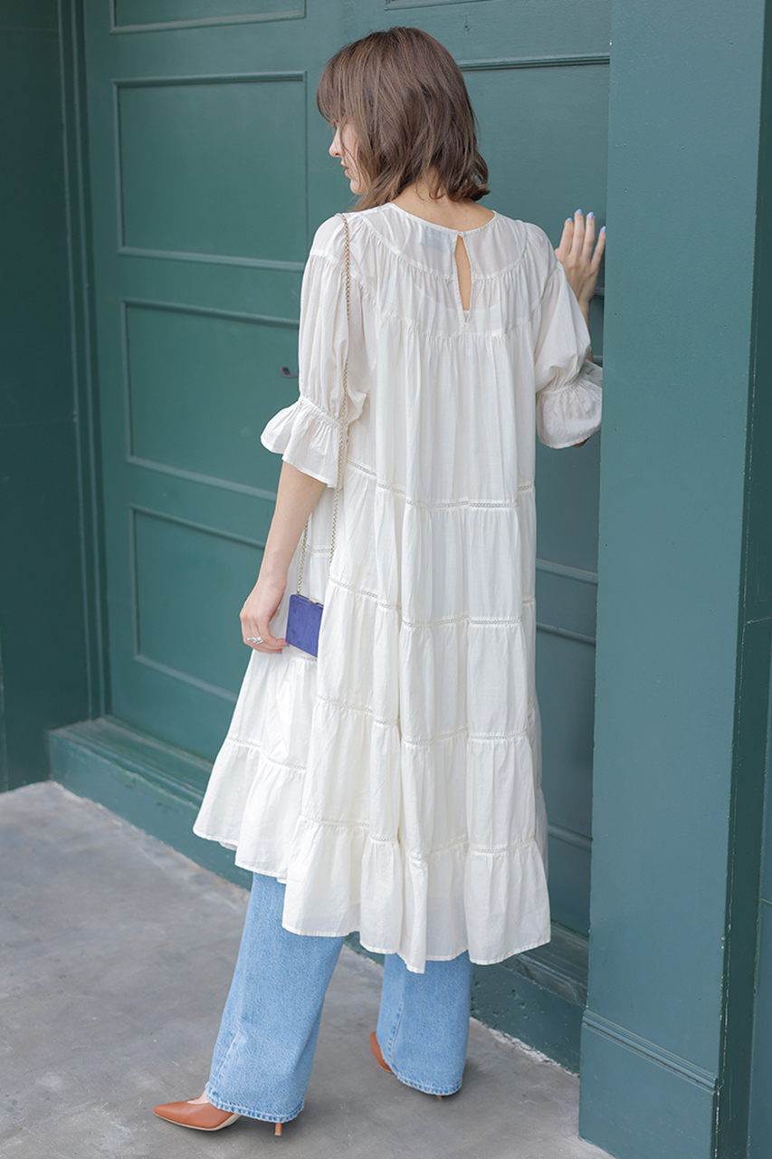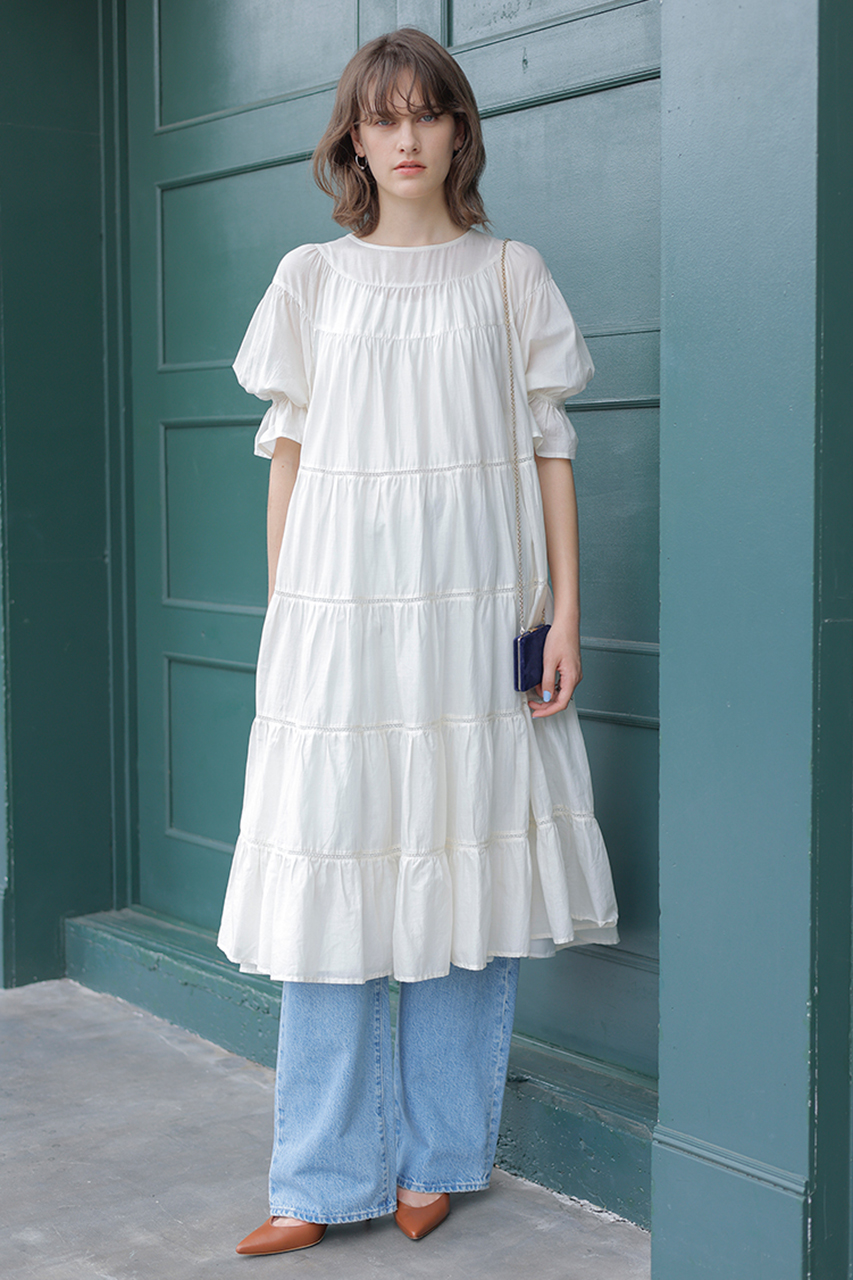 定番モデルのパフスリーブティアードドレス“PARADIS/パラディス”に新登場した日本限定カラーのアイボリー。肌なじみが良く柔らかなアイボリーは、きれいめにもカジュアルにも着まわせる万能カラーです。