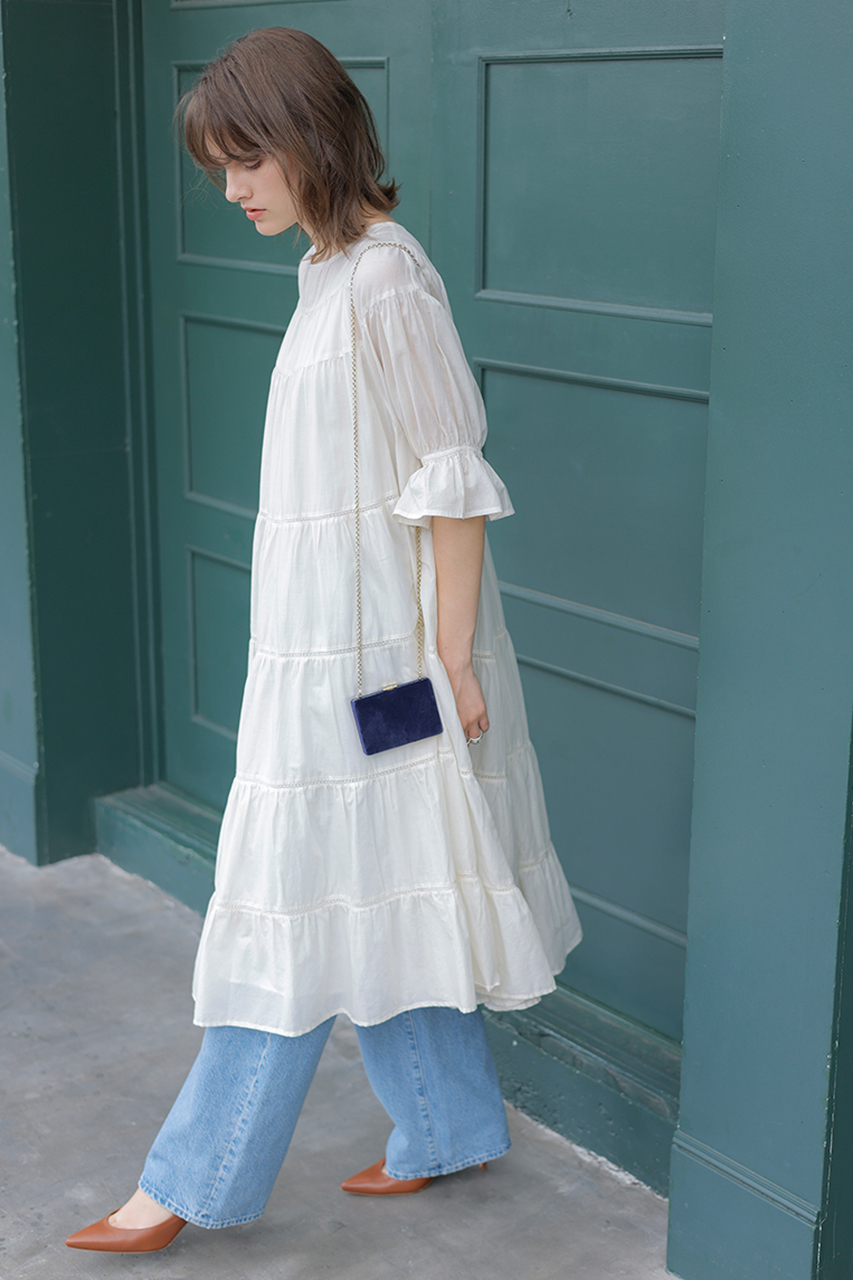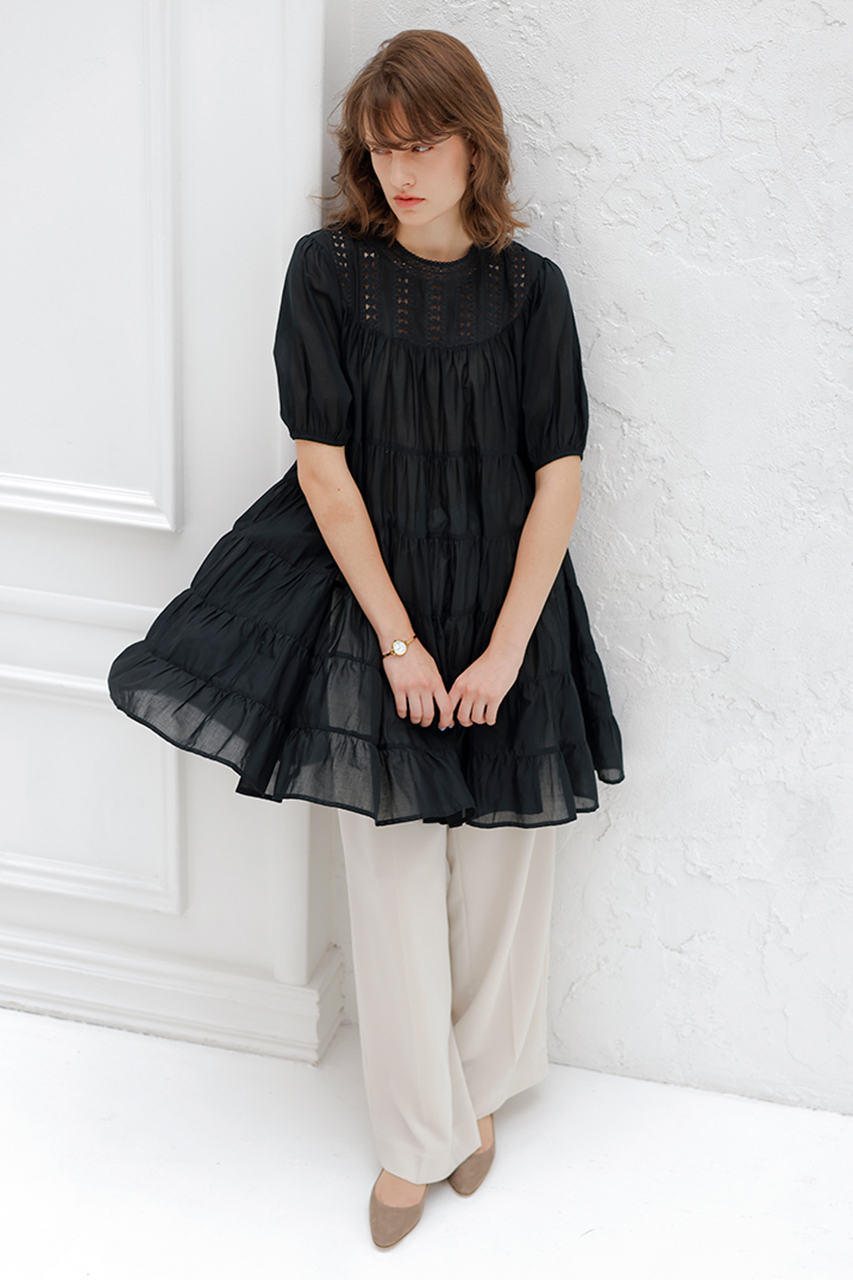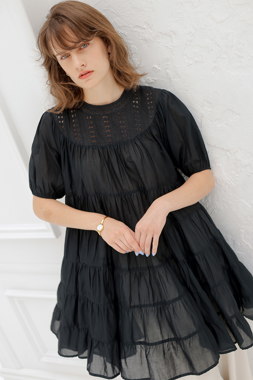 胸元にあしらわれた繊細なレースが美しいミニティアードドレス。五分袖の上品なパフスリーブと、ふんわりと広がる優しげなティアードがロマンティックな雰囲気を醸します。ワイドパンツやデニムとのレイヤードもおすすめ。