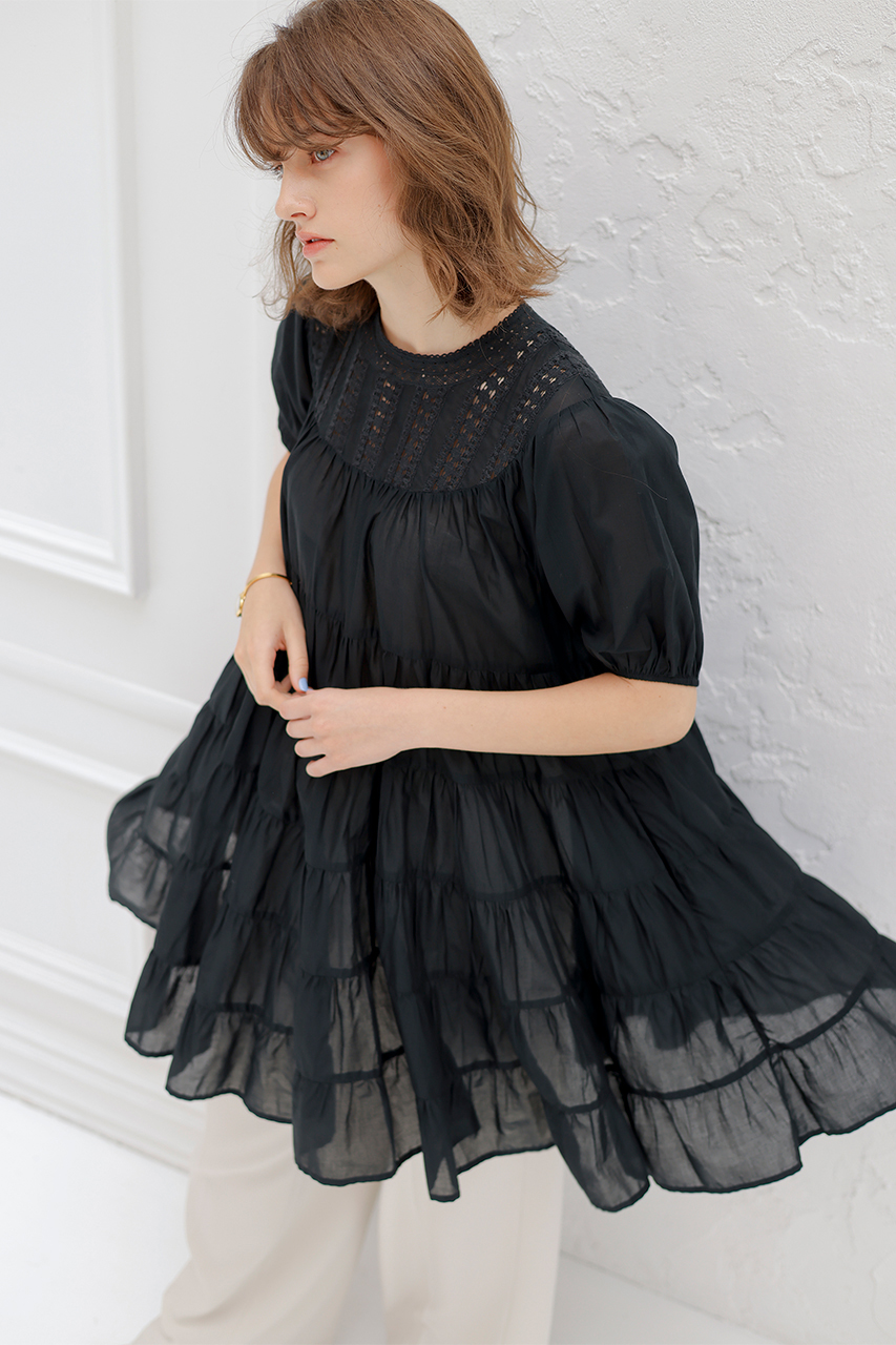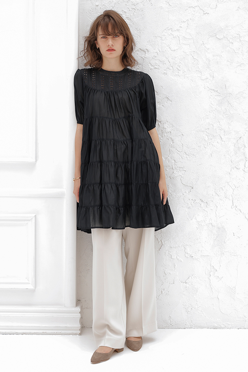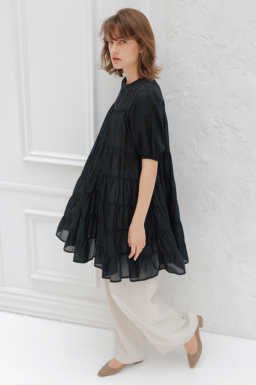 胸元にあしらわれた繊細なレースが美しいミニティアードドレス。五分袖の上品なパフスリーブと、ふんわりと広がる優しげなティアードがロマンティックな雰囲気を醸します。ワイドパンツやデニムとのレイヤードもおすすめ。