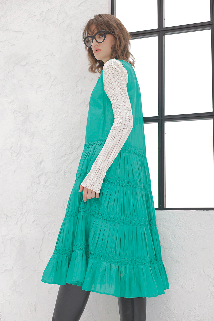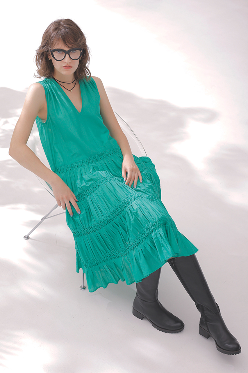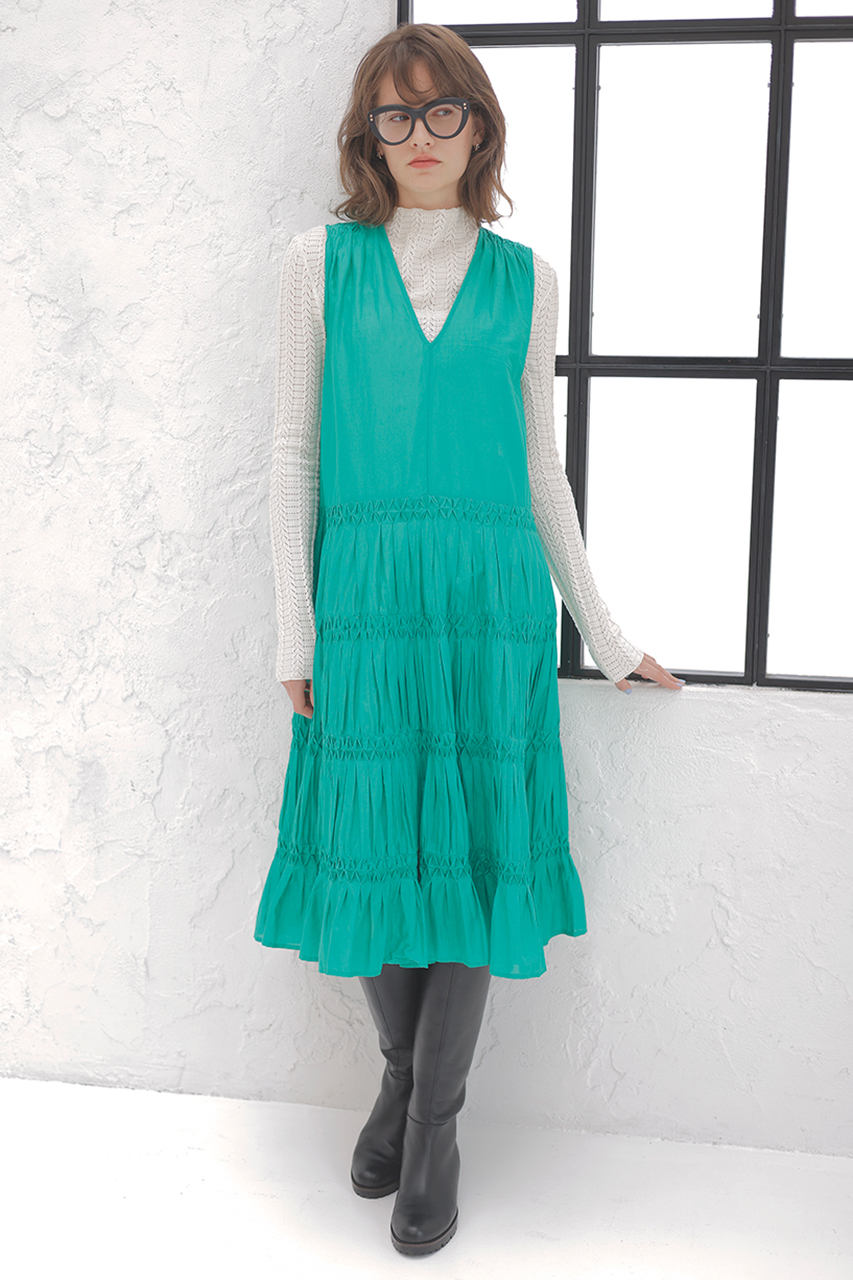 人気のVネックティアードドレス“WALLIS/ワーリス”には、秋冬のシーズンカラーとしてグリーンが登場。暑い時期には一枚で、涼しくなったらインナーをプラスして。シーズンレスに着まわせる人気モデルです。