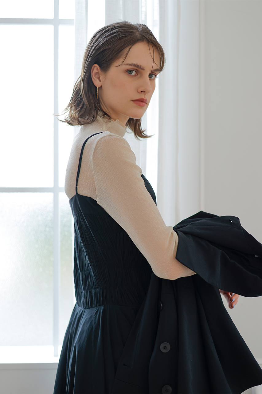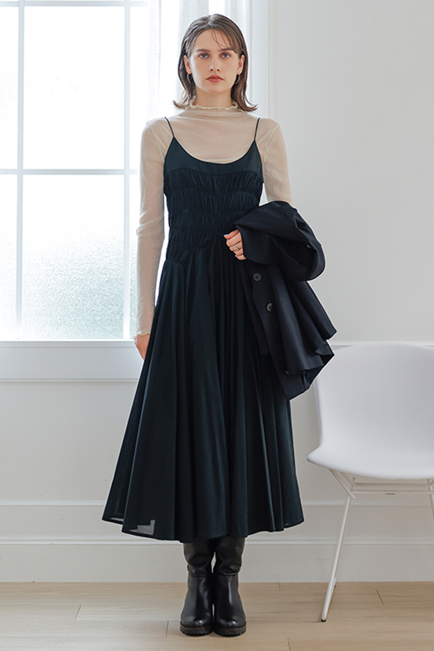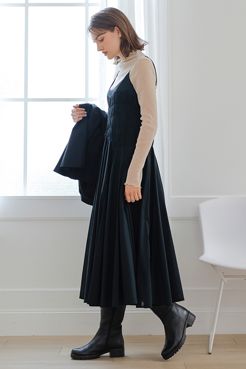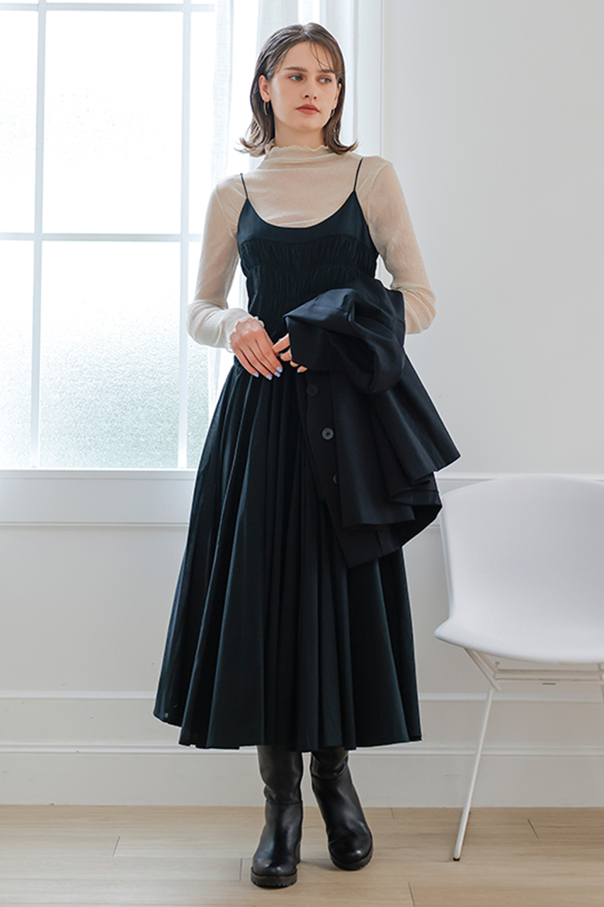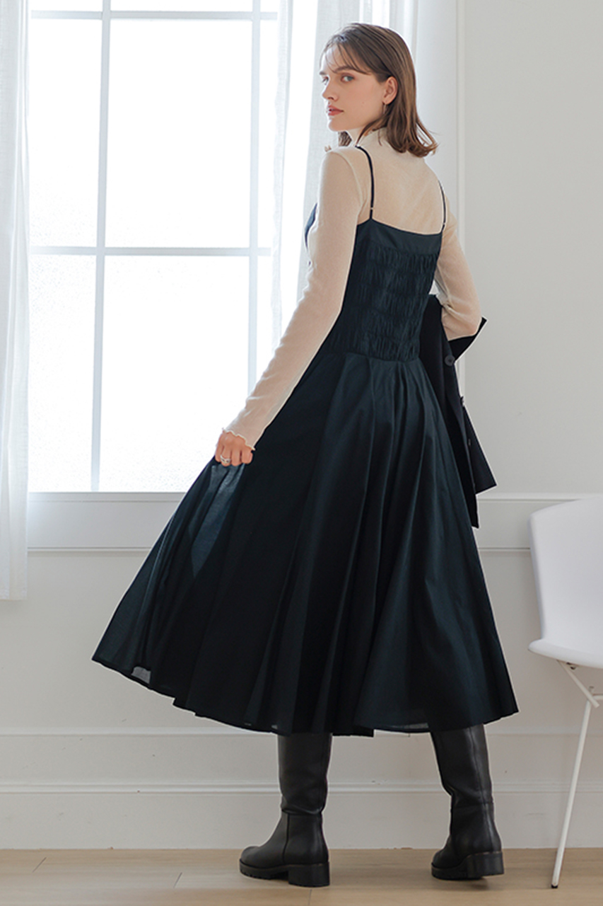自由自在な着まわしが叶うロングキャミソールドレスは、胸元からウエストにかけて施されたスモッキング刺しゅうがポイント。デイリーにもオケージョンスタイルにも着こなし次第であらゆるシーンにマッチする、ワードローブに一枚あるとコーディネートの幅が広がるアイテムです。