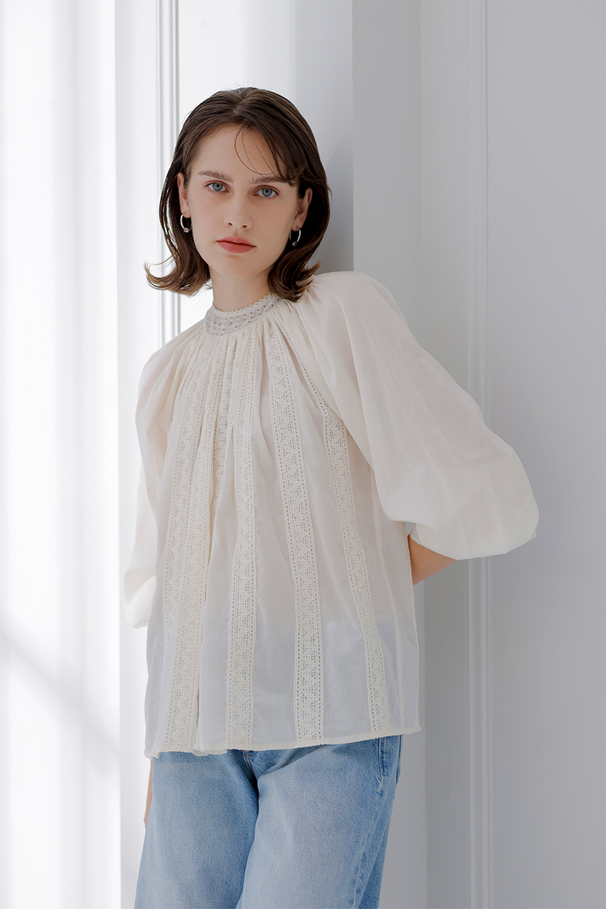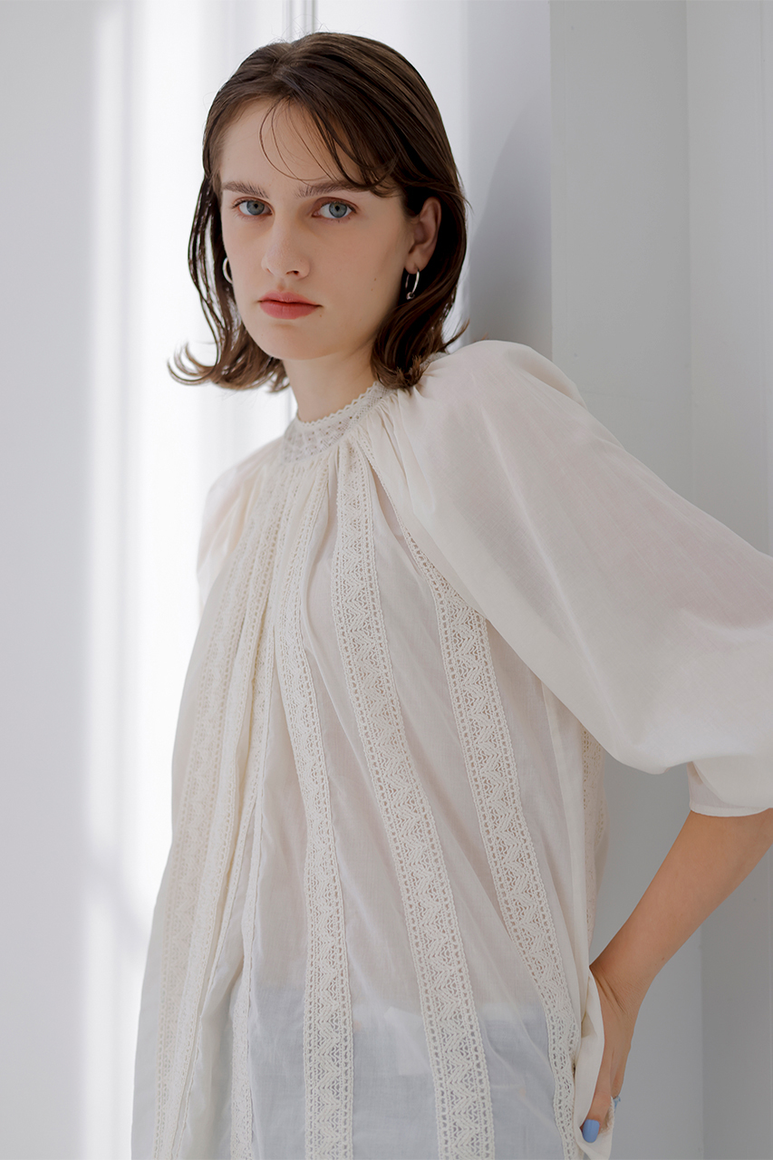 贅沢にあしらわれたレースとたっぷりのギャザーで、ふんわりシルエットに仕上げたデザインブラウス。そよ風のように軽やかな素材が、エフォートレスな女性らしさを引き立てます。