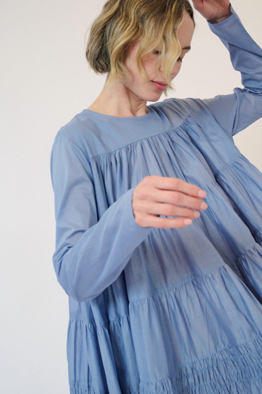 くすみカラーにおしゃれ感漂うブルー。肌なじみの良い色合いでコーディネートに取り入れやすく、一枚でスタイリングを上品で華やかな印象にクラスアップ。