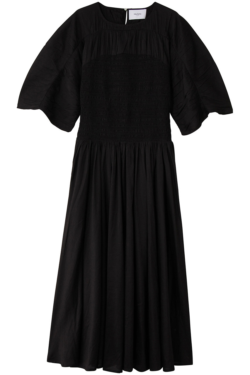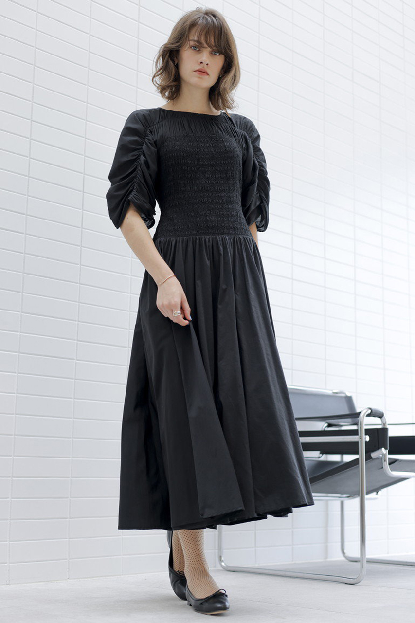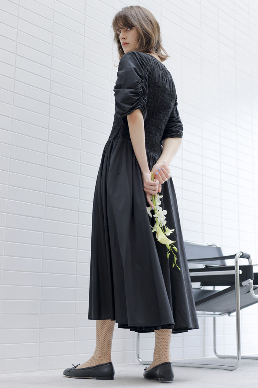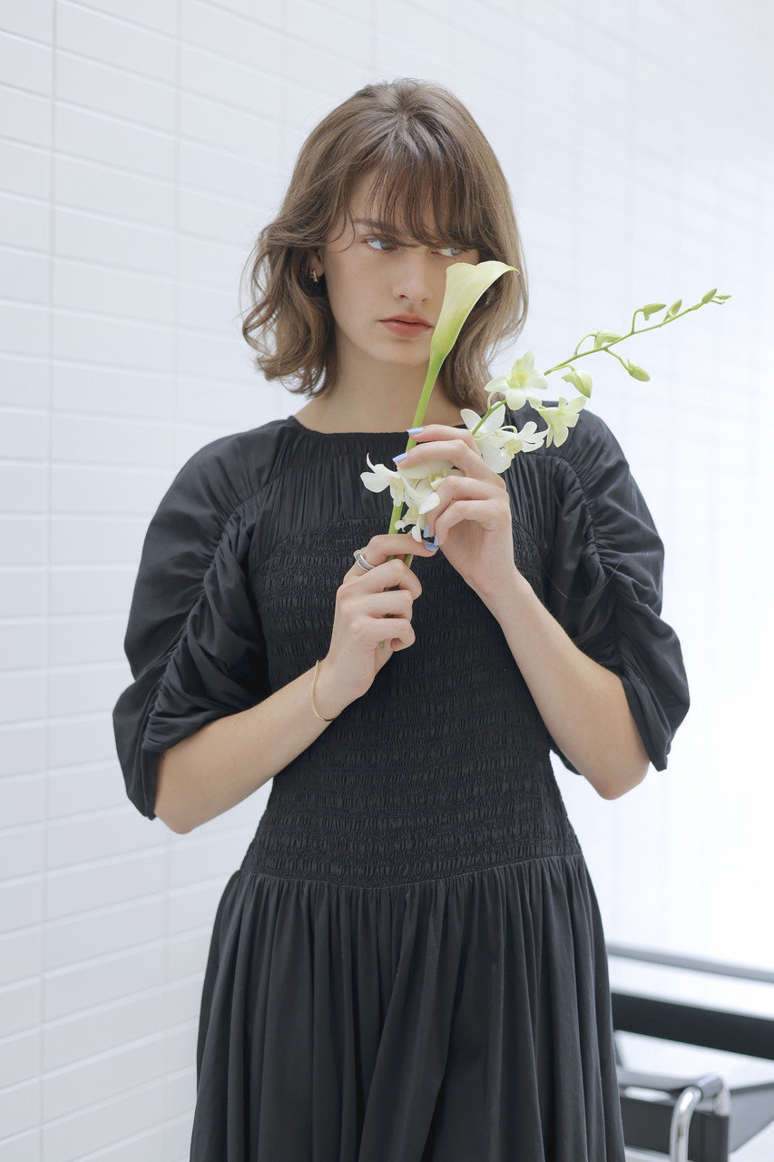 胸元から袖にかけてギャザーがあしらわれ、身体に美しくフィットするスモッキング刺繍が施されています。