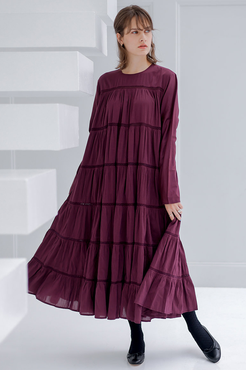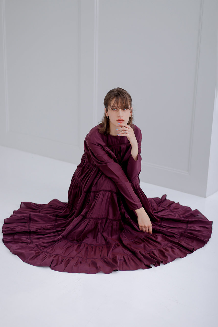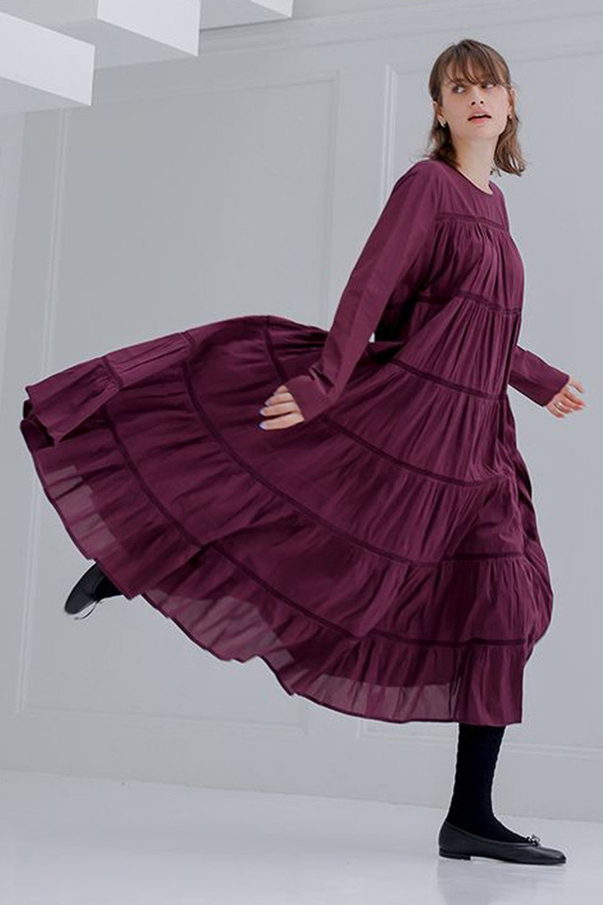 シーズンムードたっぷりのバーガンディーが上品な華やかさを醸すマキシ丈のティアードドレス"MAIDA/マイダ"。動くたびに優雅に揺れるスカートが視線を集めます。大人で知的な印象を兼ね備えたドレスはチェック必須のアイテムです。