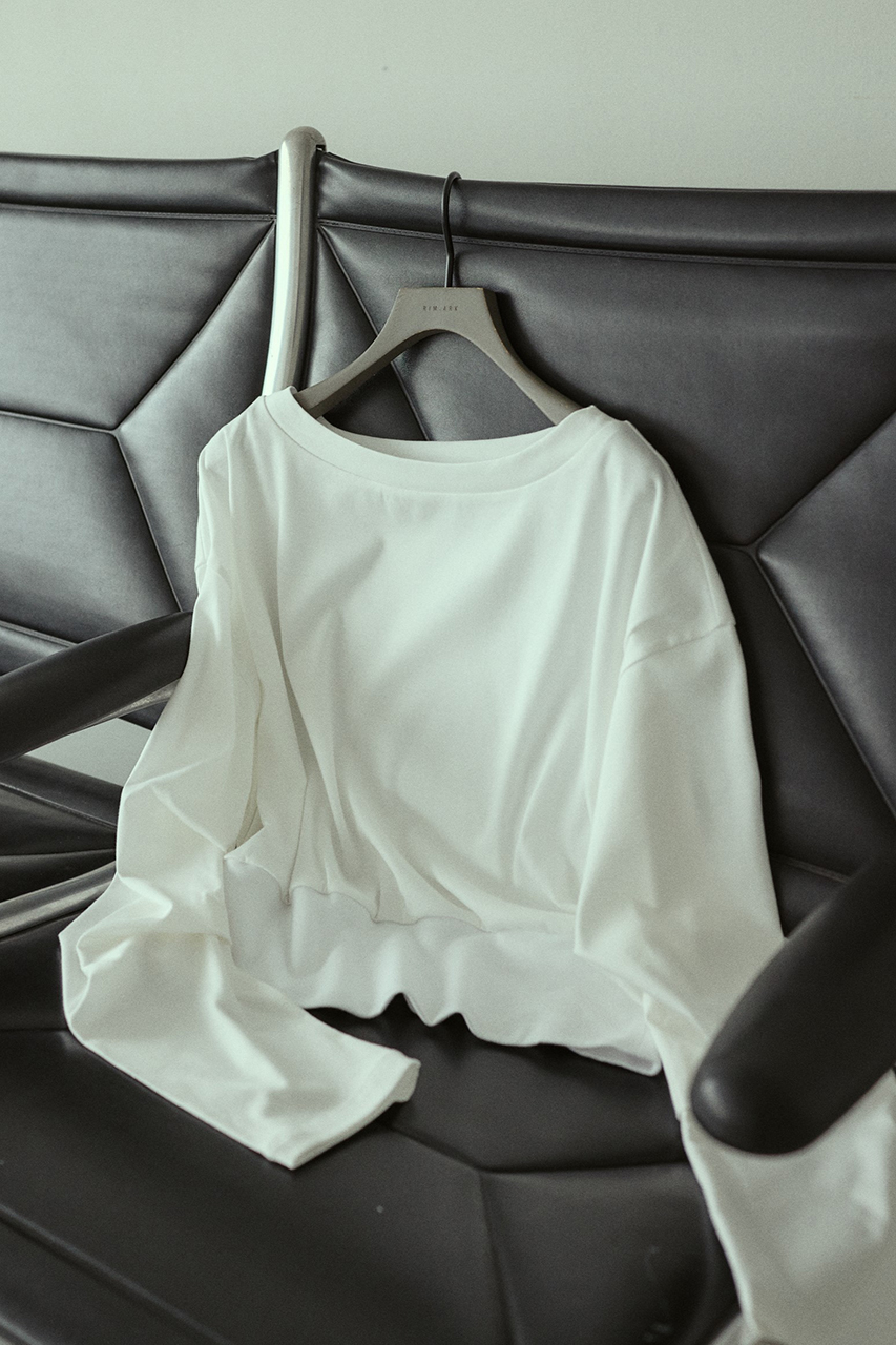 超ハイゲージに編みたてることで、綿のカジュアル感を残しながらもハリ感と滑らかな表面感が特徴の、コットンカットソー生地を使用したボートネックトップス。ウエストの切り替えとスリーブタックで立体的なシルエットを構築し、纏うだけで気負わないのにどこか雰囲気のあるスタイルを完成させます。