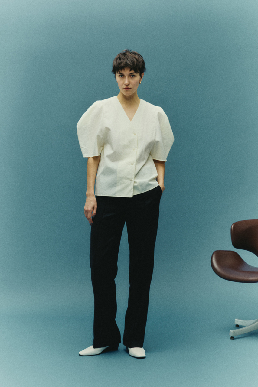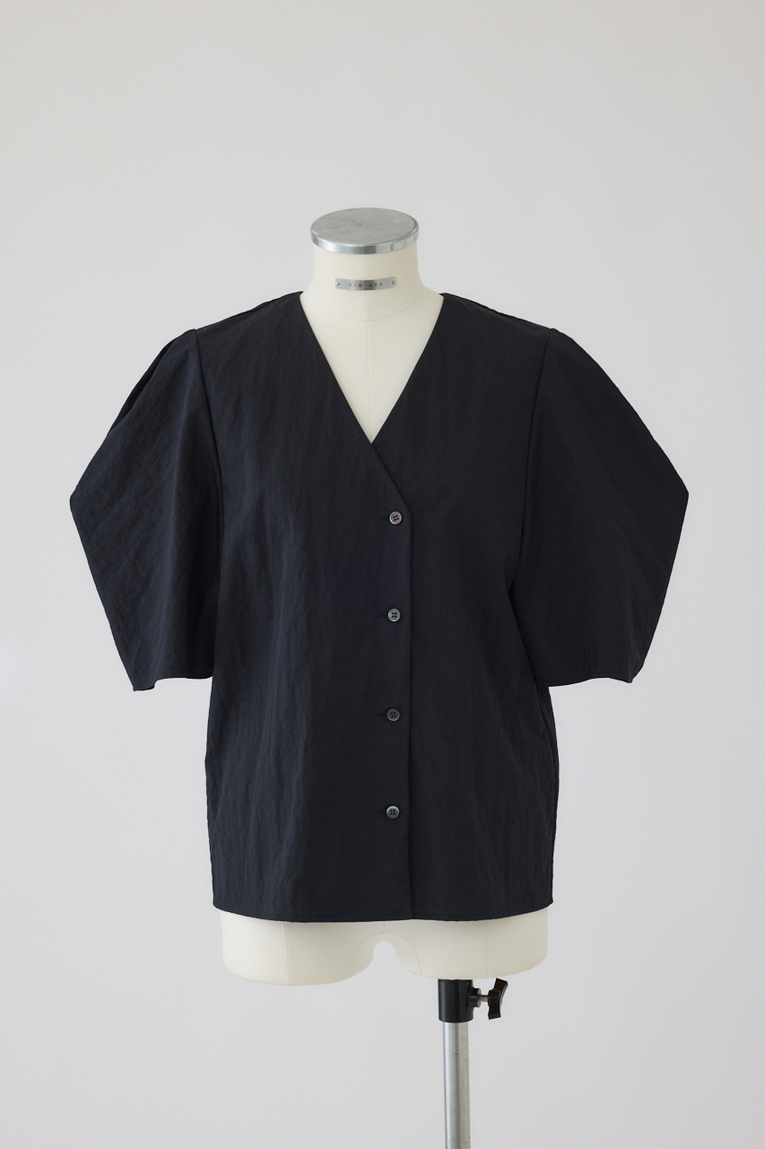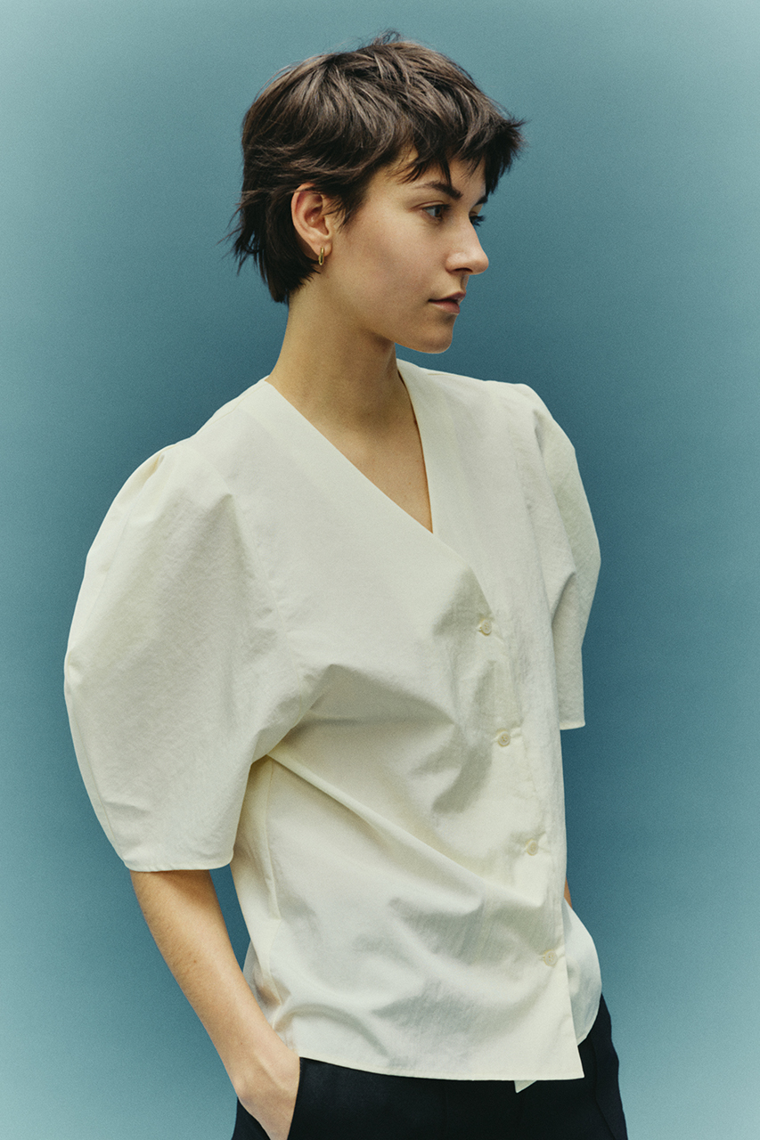 ペーパーライクな質感と空気を含んだような風合いで、暑い季節も快適な着心地を叶えてくれるボリュームスリーブVネックシャツ。