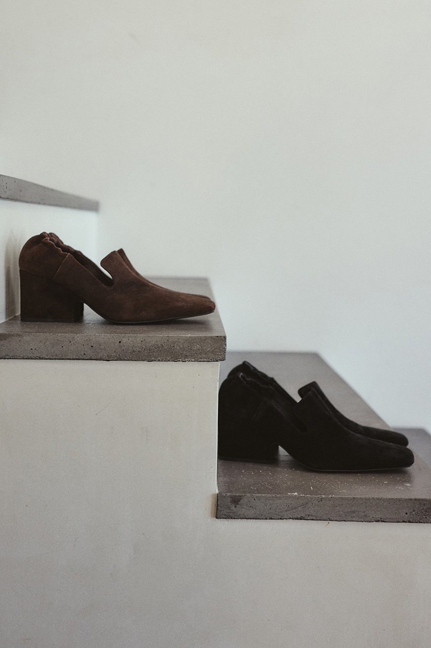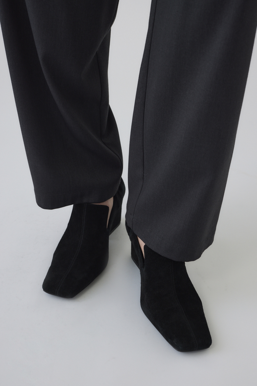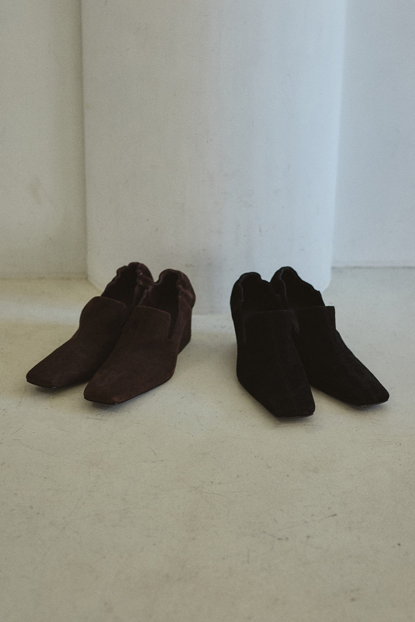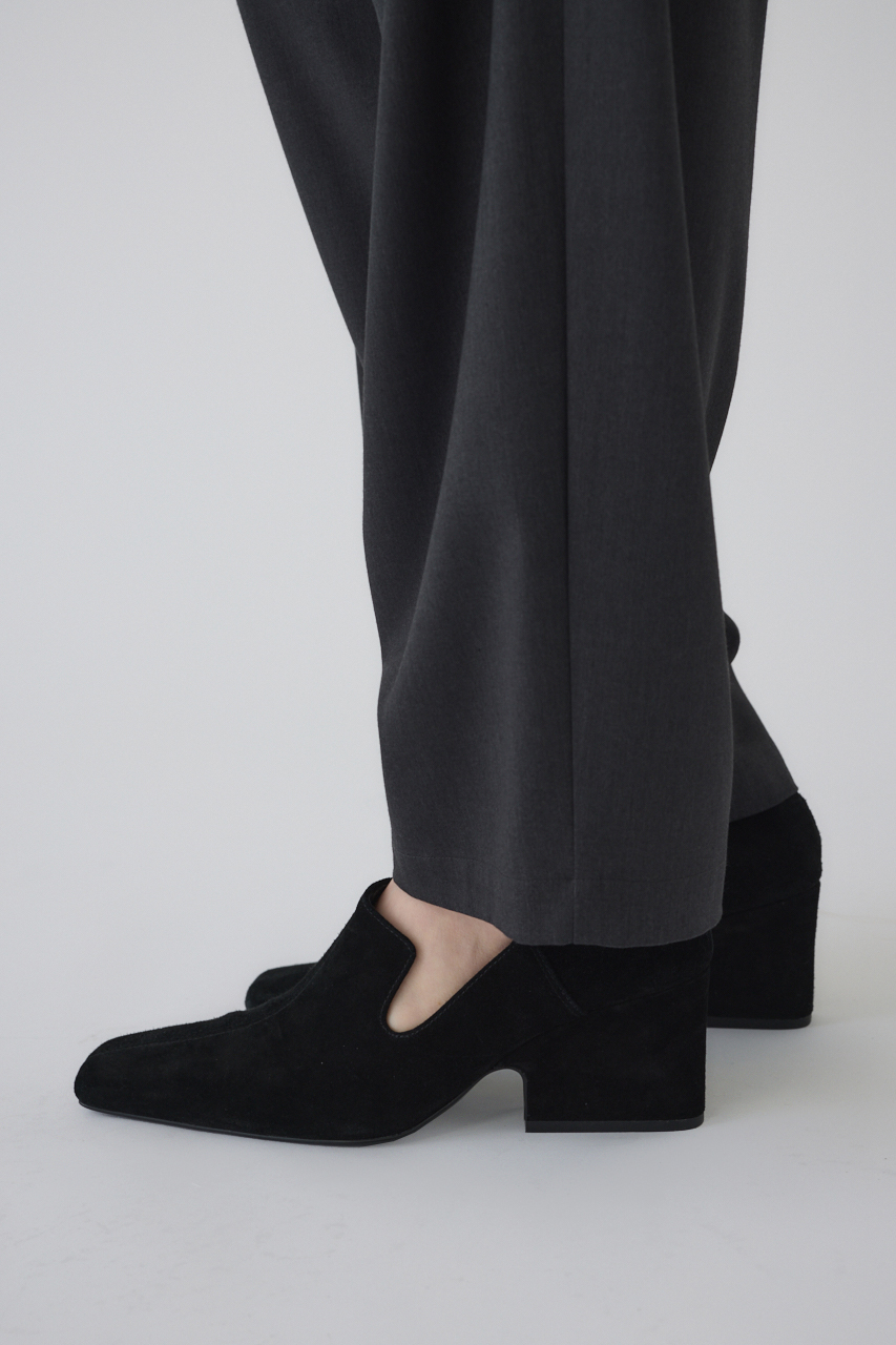洗練されたスクエアトゥデザインが特徴のスエードヒール。