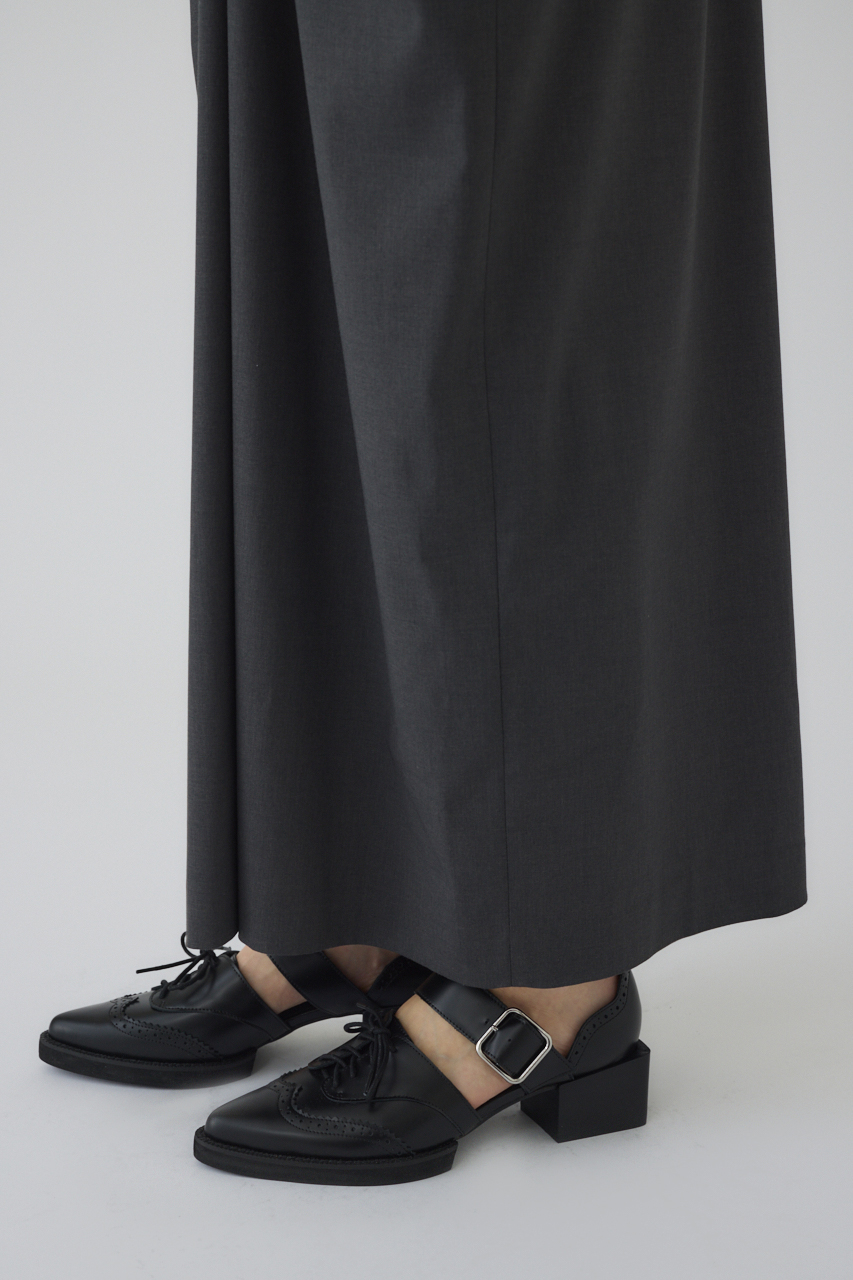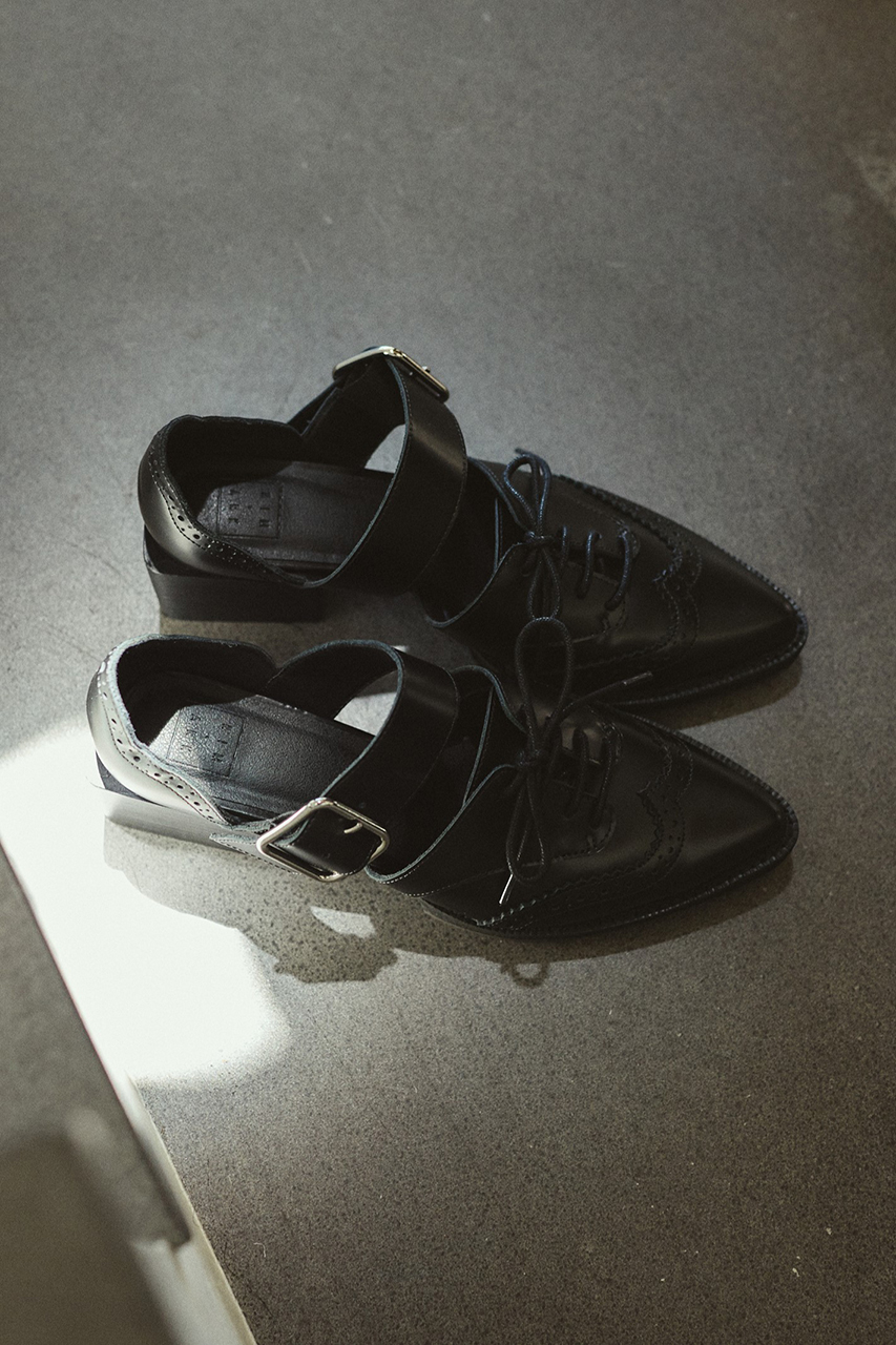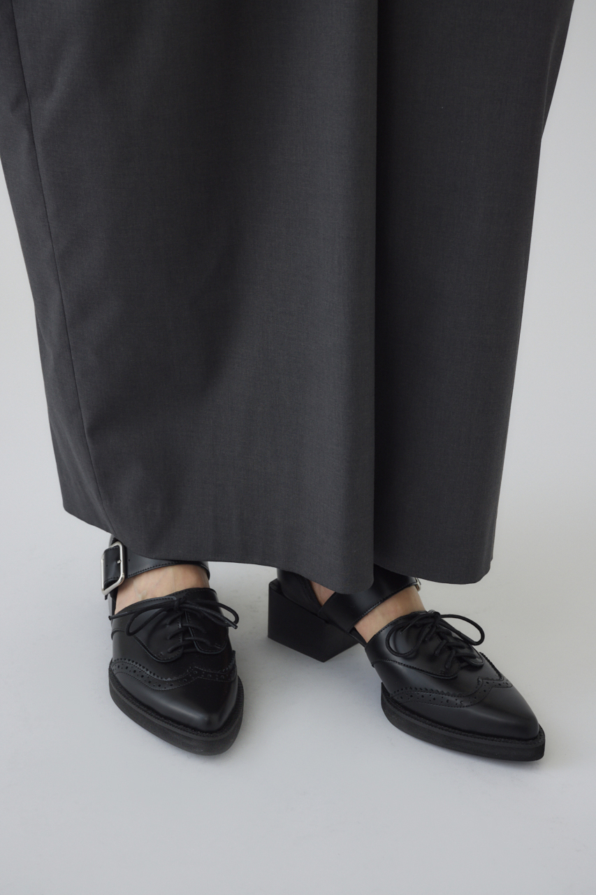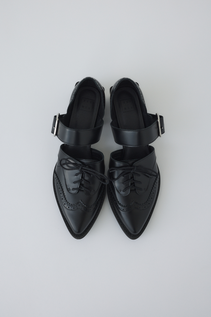 トラディショナルなウィングチップシューズをファッショナブルにアップデート。クラシカルなディテールとモードなデザインの絶妙な融合が魅力です。ポインテッドトゥとクロスストラップのモード感あふれるデザインに、クラシカルなウィングチップのディテールを組み合わせた他にはない一足。ソックスと合わせたり素足で履いたりと、ファッションやシーンに合わせて様々な表情を見せてくれます。シックなパンツスタイルから、軽やかなスカートスタイルまで幅広く対応。