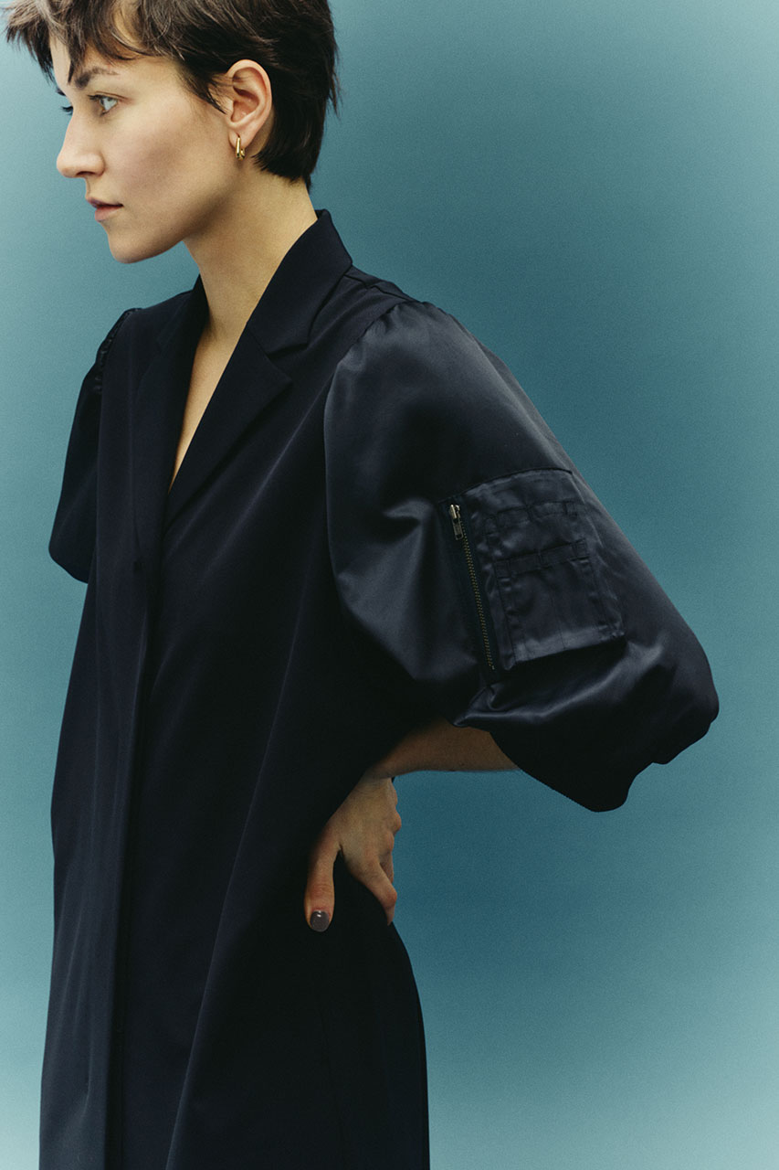 ハーフスリーブのMA-1袖とテーラーカラーのデザインが、モードで都会的な顔をしたワンピース。1枚で洗練されたルックを実現。異素材切り替えのデザインで袖やリブの生地は薄手の柔らかい風合いを採用。シックにまとまる落ち感が魅力の身頃のツイル生地は、UVカットかつたっぷりとした身幅でボディラインも拾わないデザイン。前開きの仕様で、ロングシーズン愛用できるアイテム。