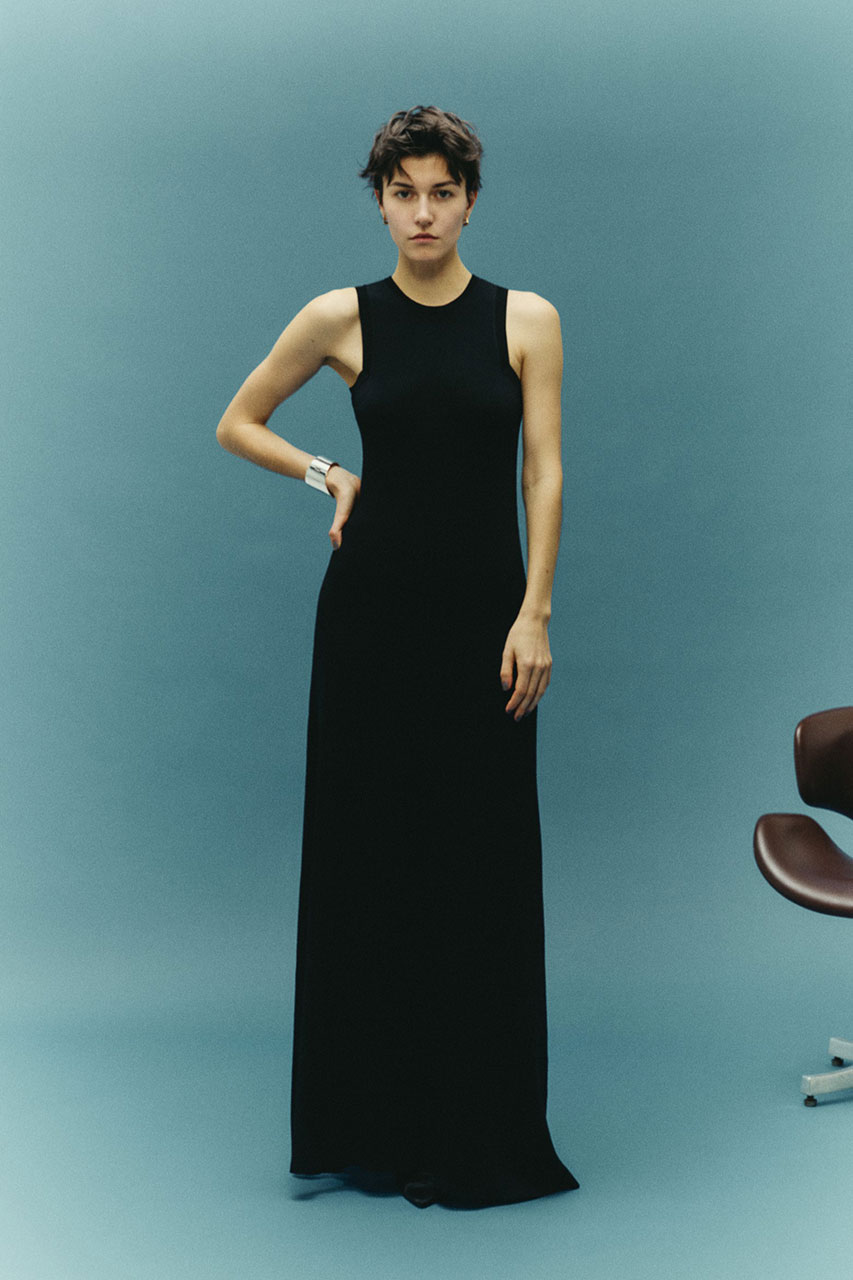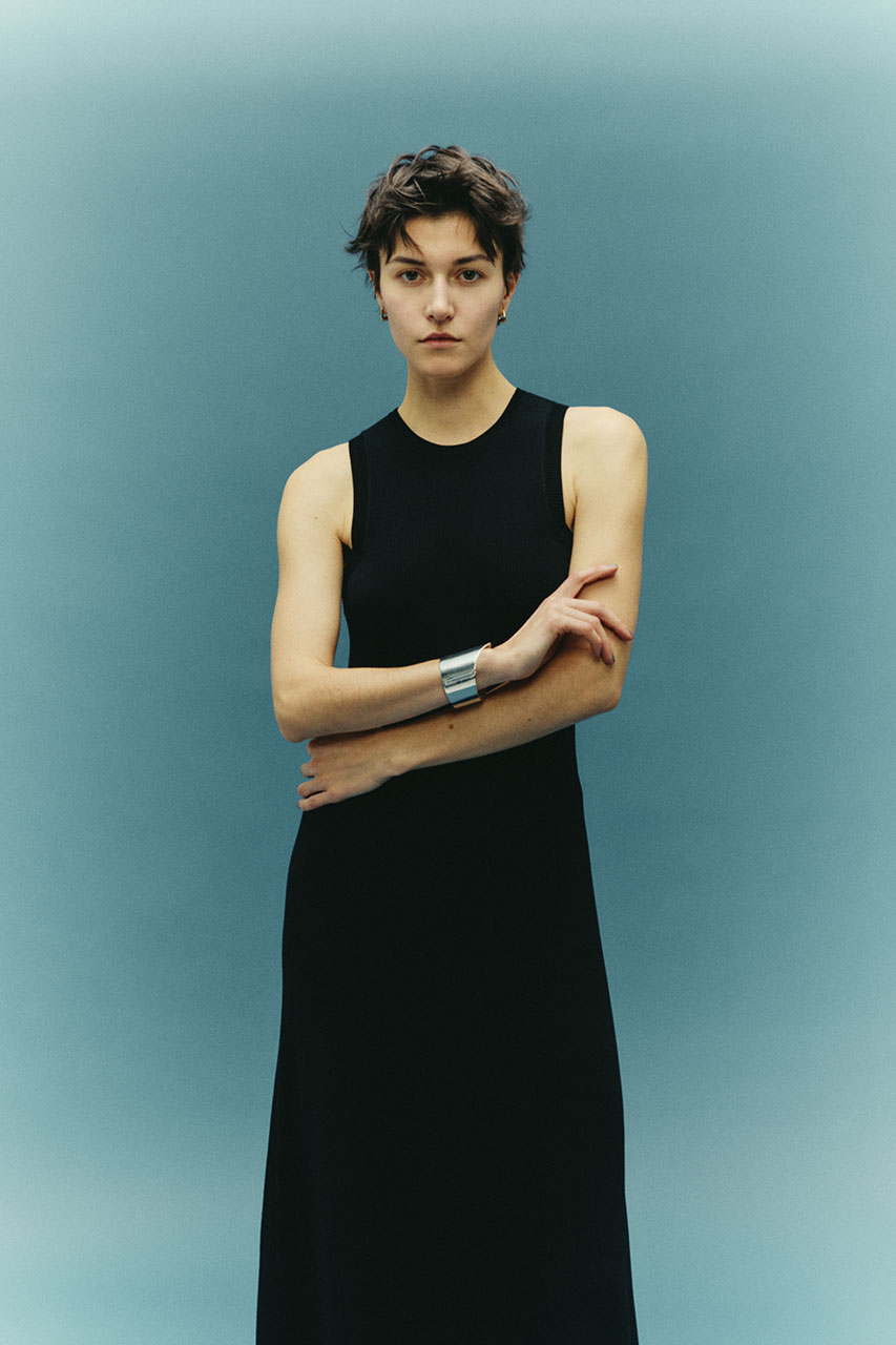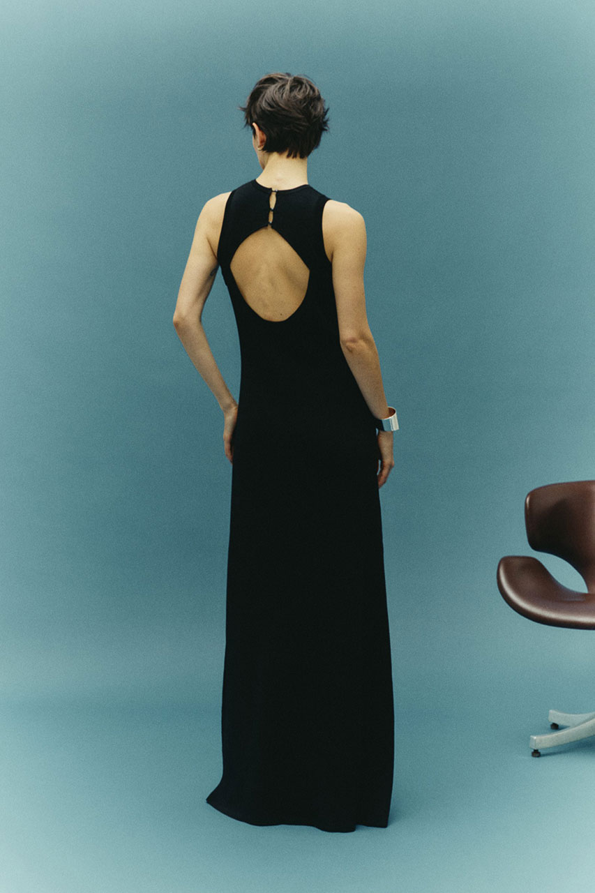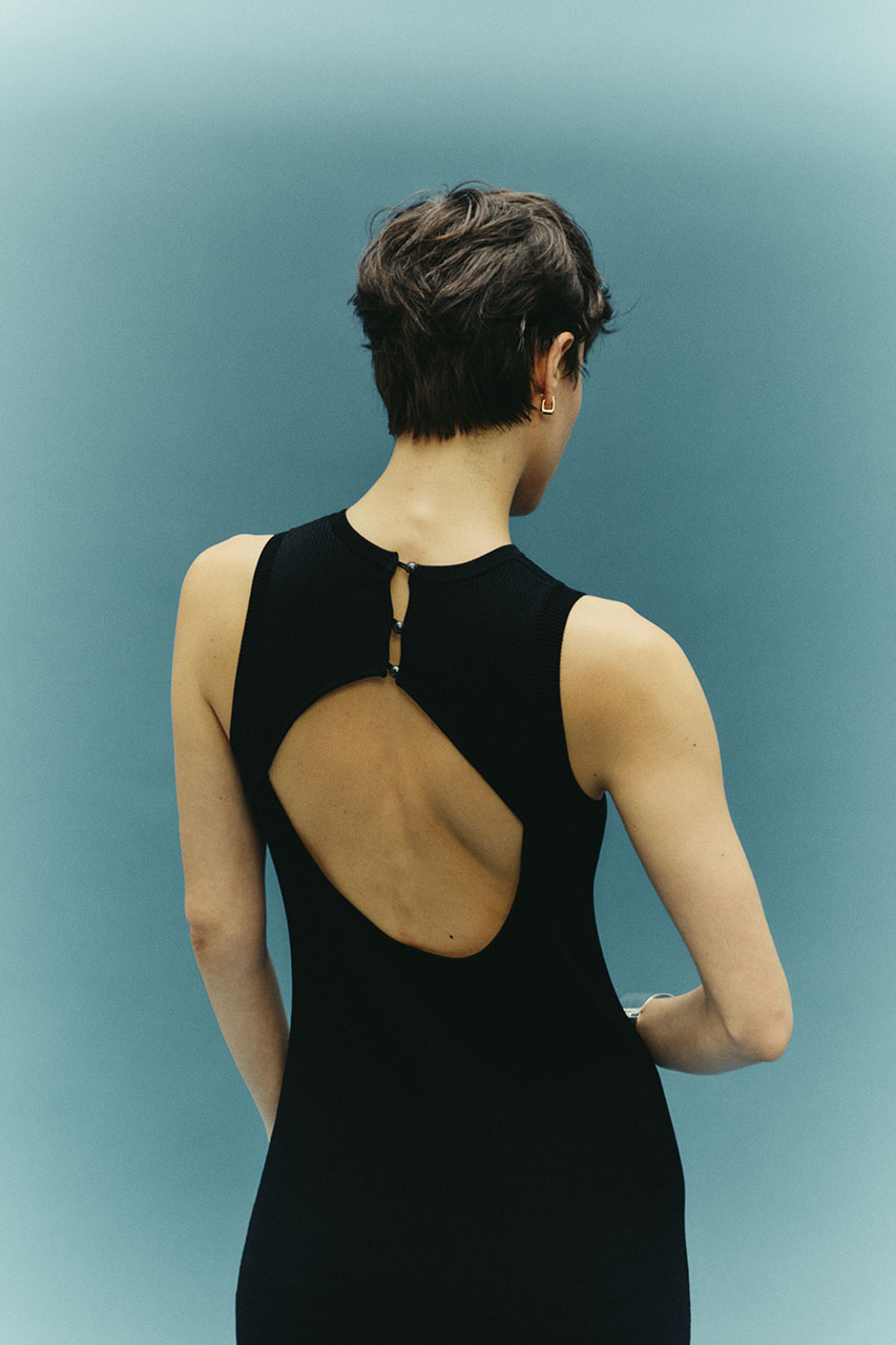 ミニマルでありながら、大胆な背中のカットアウトが印象的なマキシ丈ワンピース。滑らかで落ち感のあるビスコース・ナイロンの編み地はさりげない柄編みで、大人の女性の魅力を引き立てるデザイン。特別なシーンにもマッチするシティ・エレガンスを感じる1着。