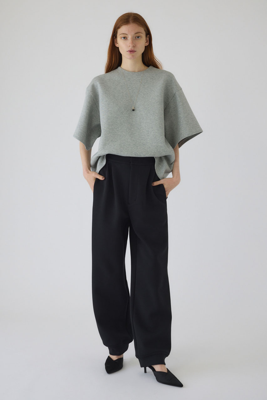 綿のナチュラル感もありながら綺麗めな目面に仕上げた、膨らみとボリューム感が特徴のストレッチ混ダンボール生地を使用したパンツ。スウェットライクなルックスながら、軽量でドライタッチかつ程よく柔らかい風合いの生地で、カジュアルすぎない大人のCITYリラックススタイルが叶うこだわりの1本が完成。裾の切り替えと、あえてスラックスのようなウエストディティールを採用したデザインがポイント。同素材のSweat H/S POとセットアップで着用が可能。