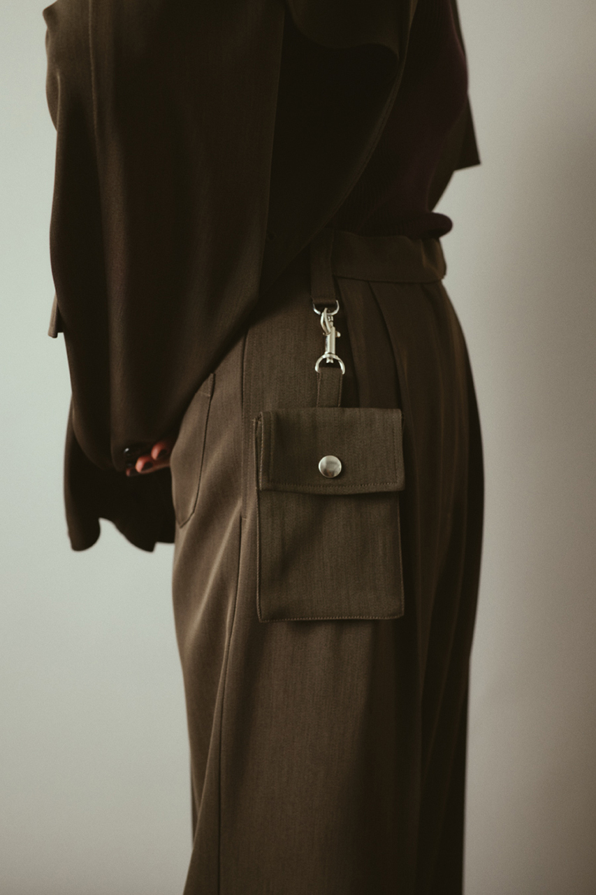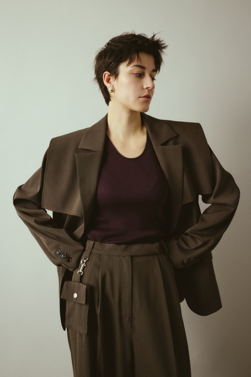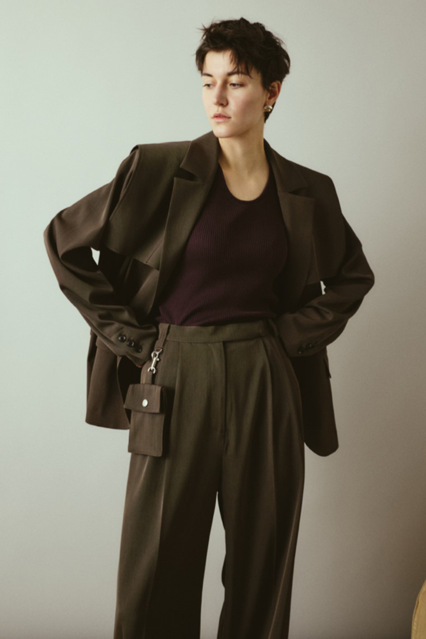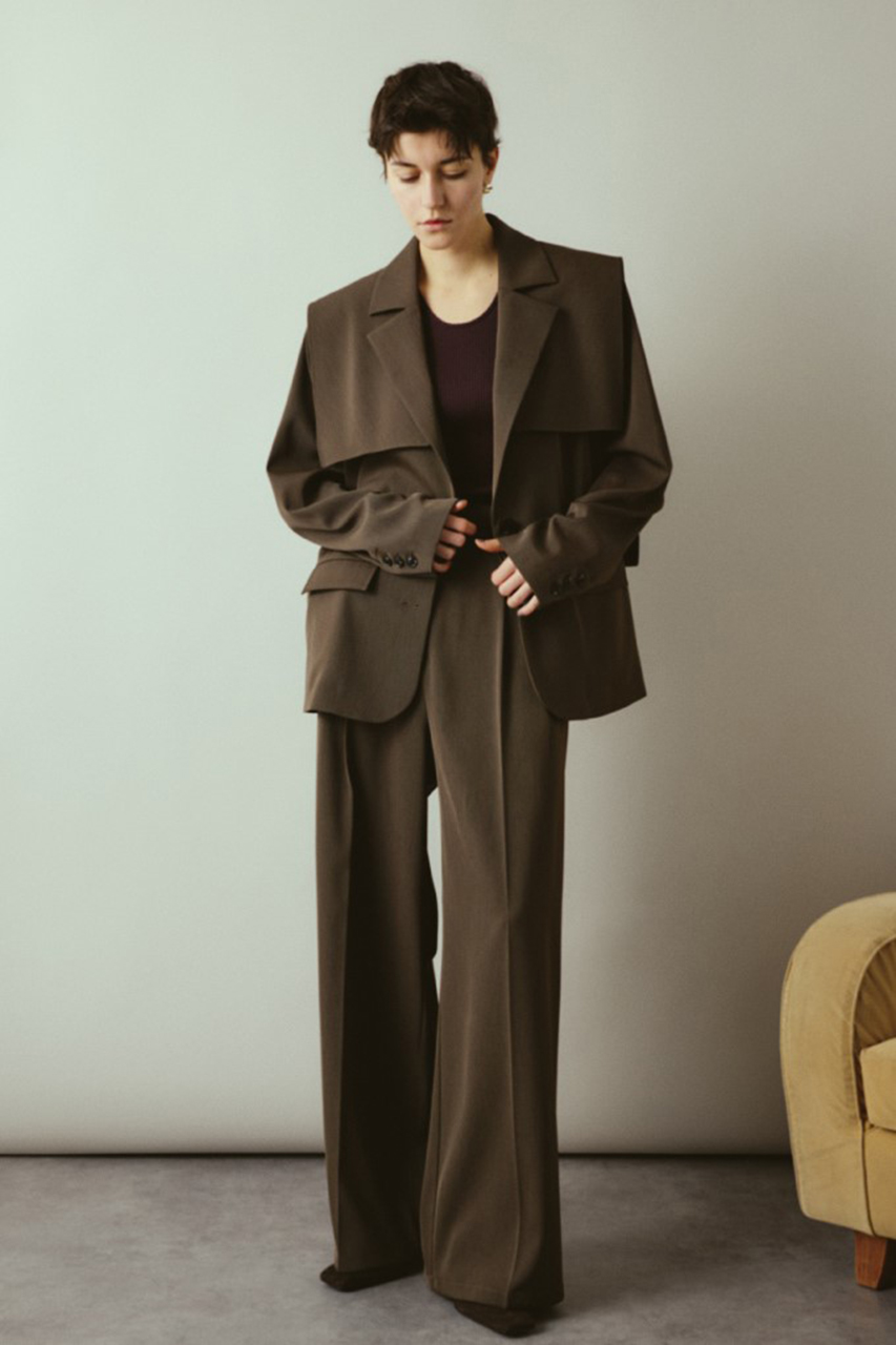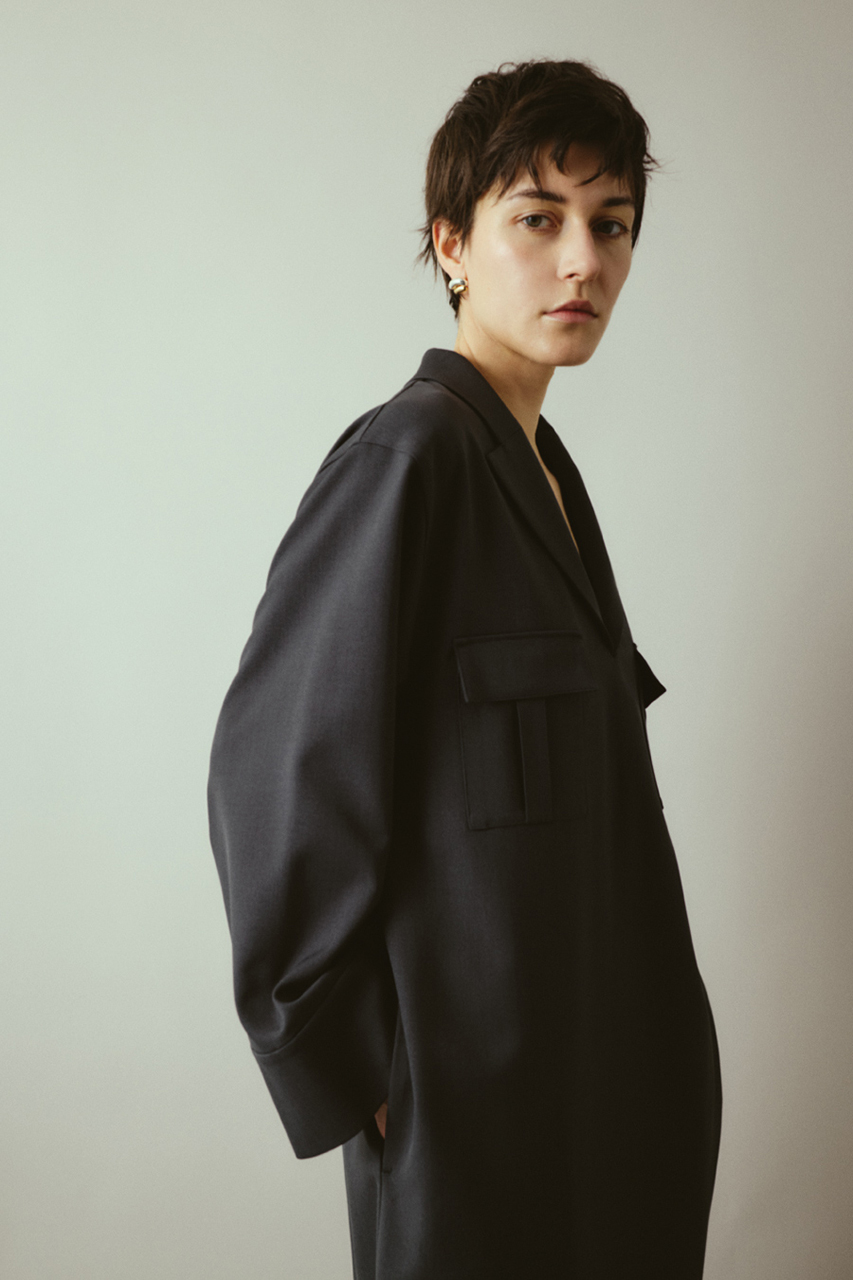 トレンチコートのフラップディテールが取り外し可能な2WAY仕様。モードスタイルからシンプルスタイルまで用途に合わせて楽しめるマニッシュジャケット。強撚糸ツイル生地使用でドライなタッチ、シワになりにくくオールシーズン対応。上品でありながらイージーケアを実現した優秀な一枚。同素材のPouch set wide PTとのセットアップコーデがおすすめ。フラップ付きでモードに外してベーシックにと着回し自在。