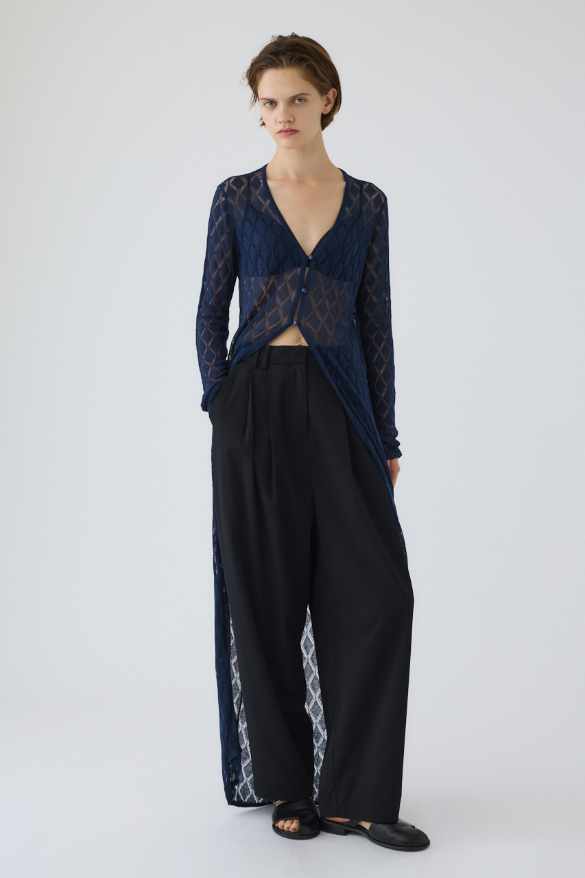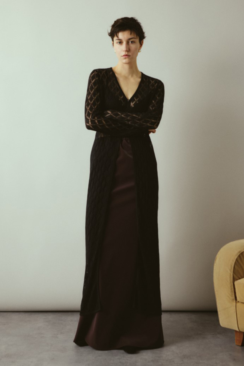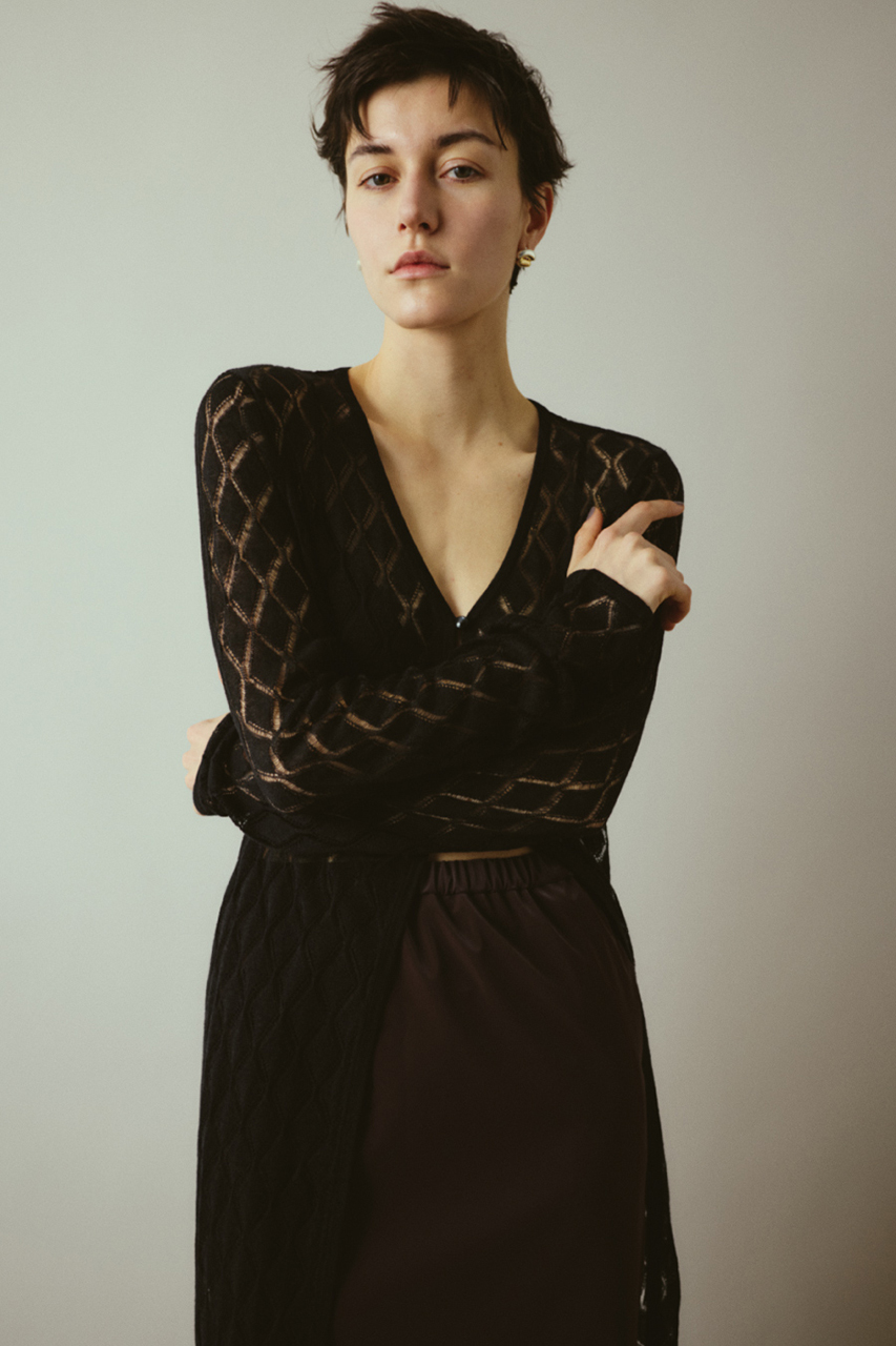 繊細な透け感で美しさ際立つロングガウン。ダイヤ柄の編み模様がさりげないエッジを加え、スタイリングに抜け感とモードな雰囲気をプラス。フロントのボタンを閉じてトップス風に着こなすのも、羽織りとしてレイヤードを楽しむのもおすすめです。軽やかな着心地で、ロングシーズン活躍する万能アイテム。シンプルなインナーと合わせるだけで洗練されたスタイルが完成します。